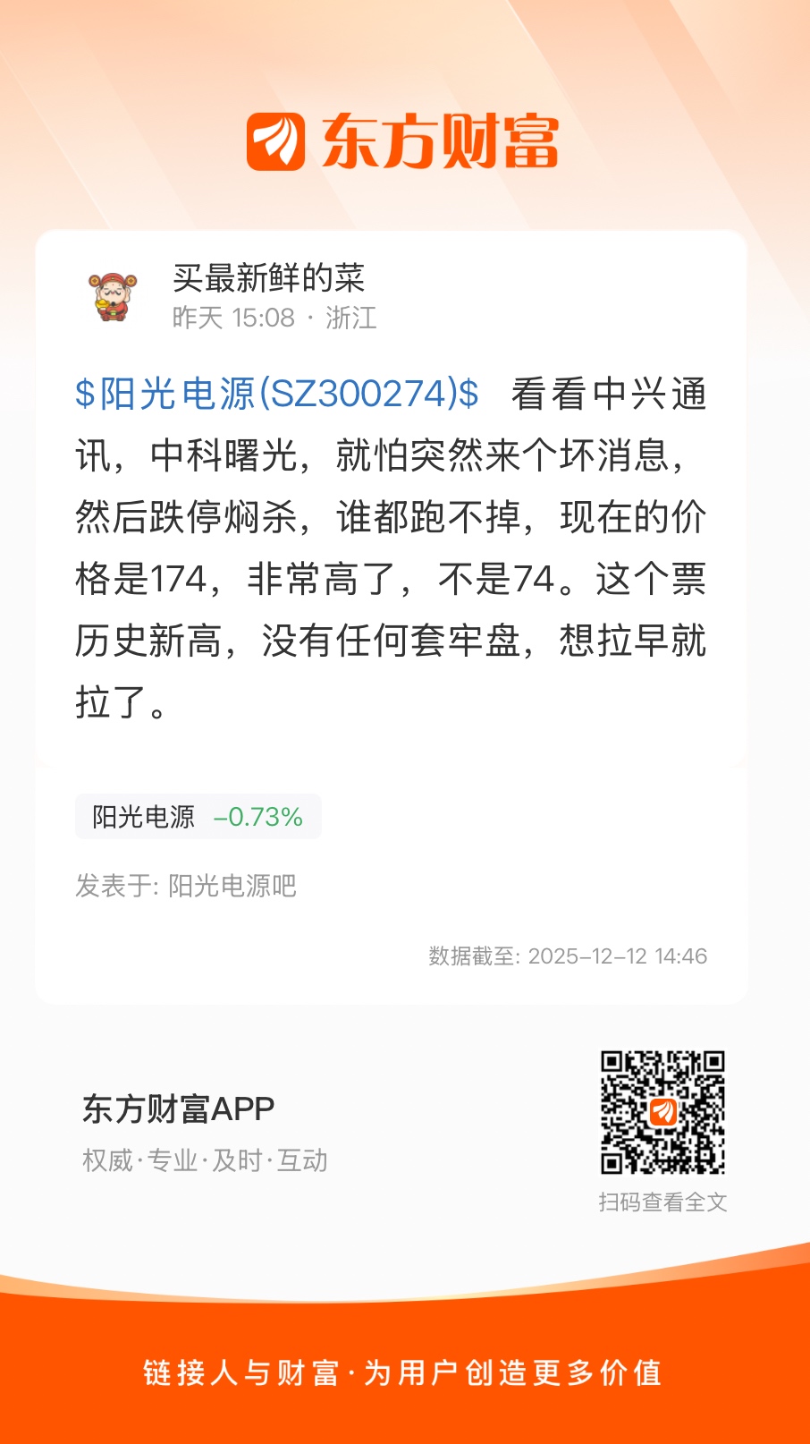 $阳光电源(SZ300274)$ 看看中兴通讯,中科曙光,就怕突然来个坏消息,然后跌停焖杀,谁都跑不掉,现在的价格是174,非常高了,不是74。这个票历史新高,没有任何套牢盘,想拉早就拉了。