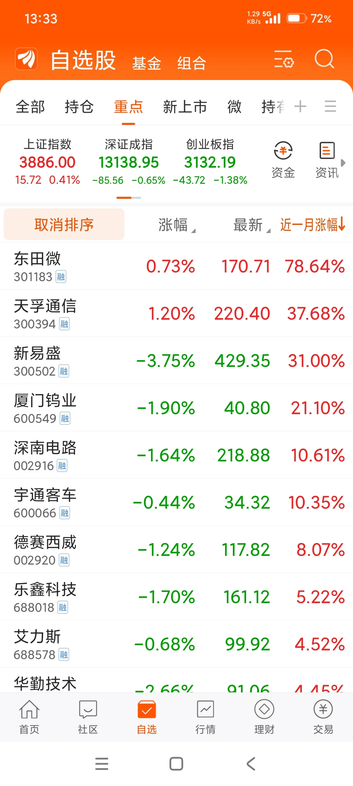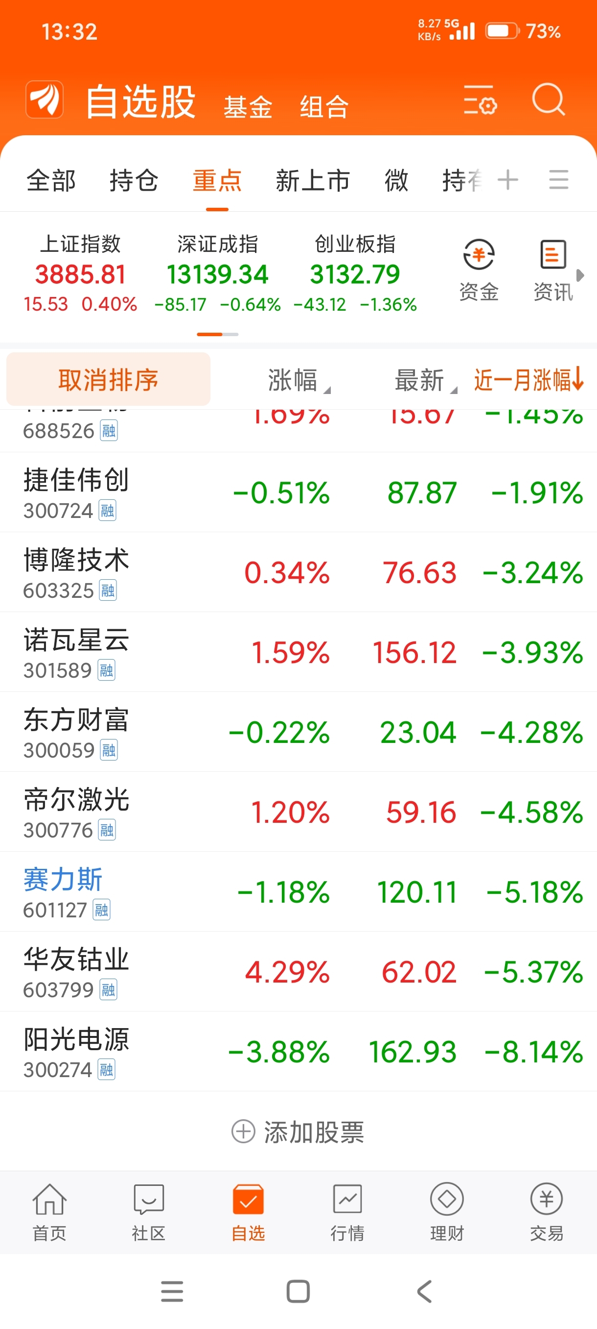 自选了20多只股,最近一个月属阳光跌的多,新易盛可以连续十几天红,这货想连续两天