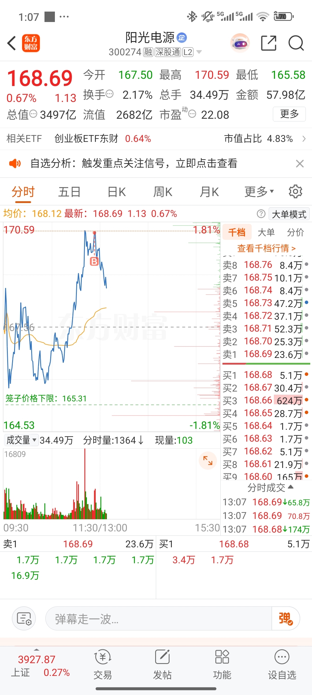 $阳光电源(SZ300274)$ 昨天卖飞了,今天看到他要起飞很生气,我果断买了一手直接把他干下来