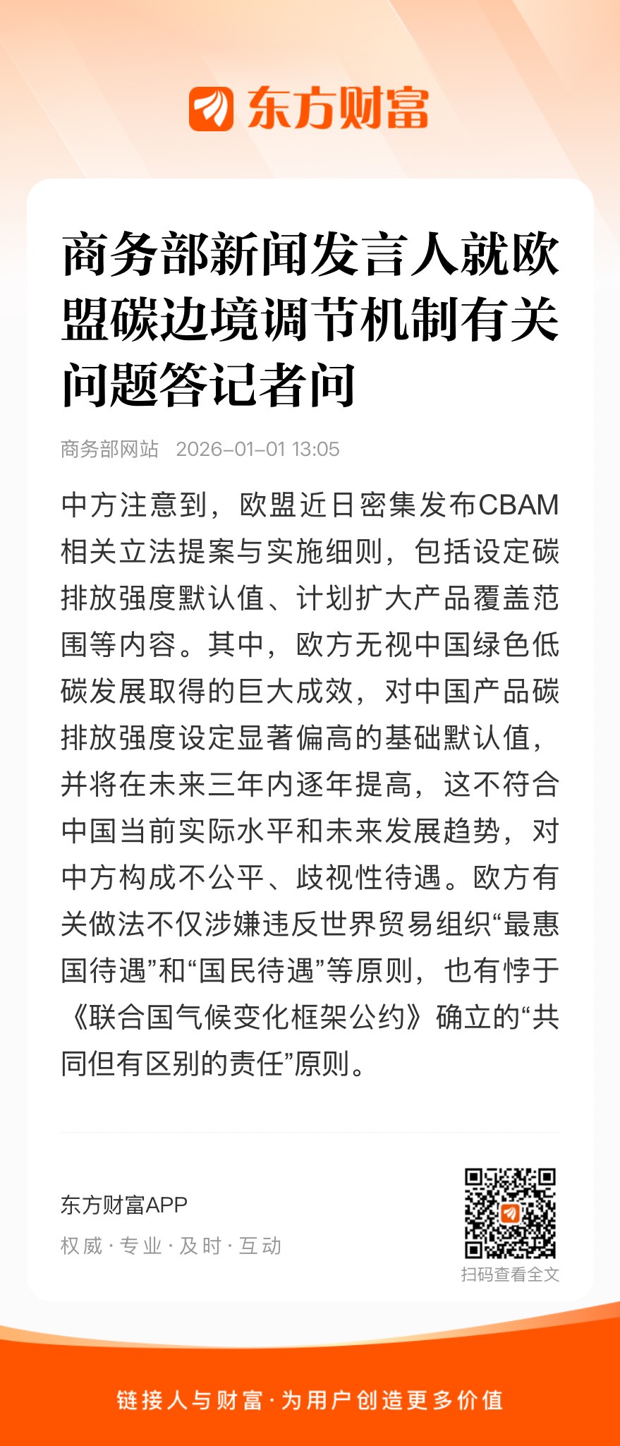 问:欧盟碳边境调节机制(CBAM)于2026年1月1日起正式实施,欧盟近日密集发布CBAM相关立法提案与实施细则,请问商务部对此有何评论?