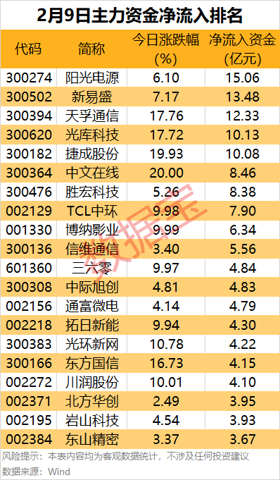 储能龙头股阳光电源上涨6.1%,主力资金净流入15.06亿元,居首。CPO龙头股新易盛上涨7.17%,主力资金净流入13.48亿元,居次席。