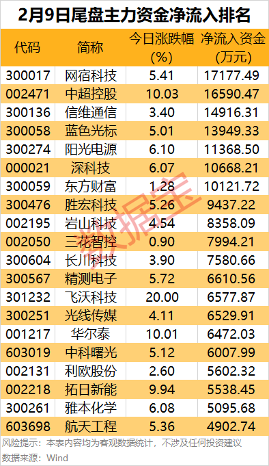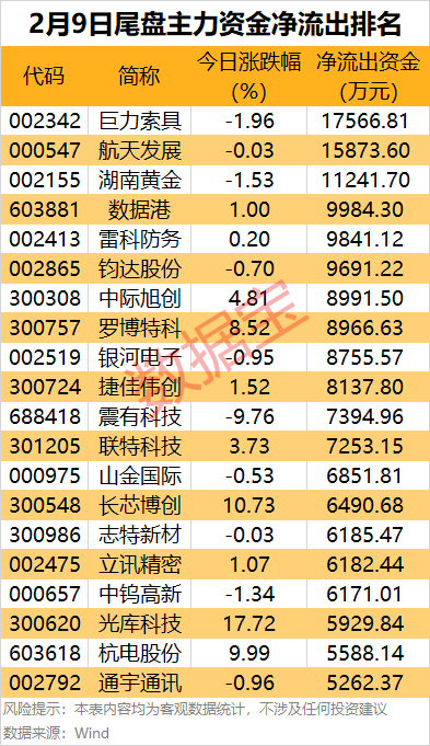 此外,还有数据港、雷科防务、钧达股份、中际旭创等热门股尾盘主力资金净流出金额居前。