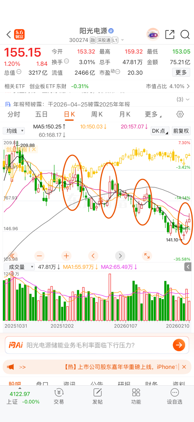 $阳光电源(SZ300274)$ 每次长上影,都是新一轮下跌的开始…