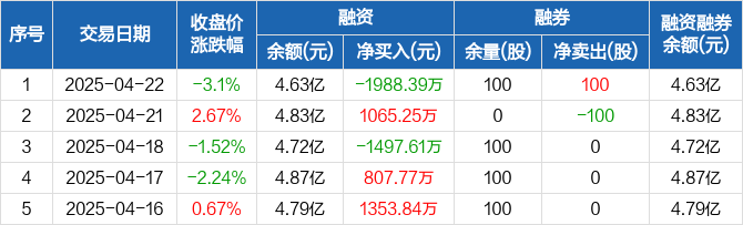 三丰智能:融资净偿还1988.39万元,融资余额4.63亿元(04-22)