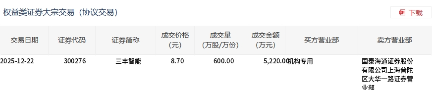 三丰智能今日大宗交易折价成交600万股,成交额5220万元