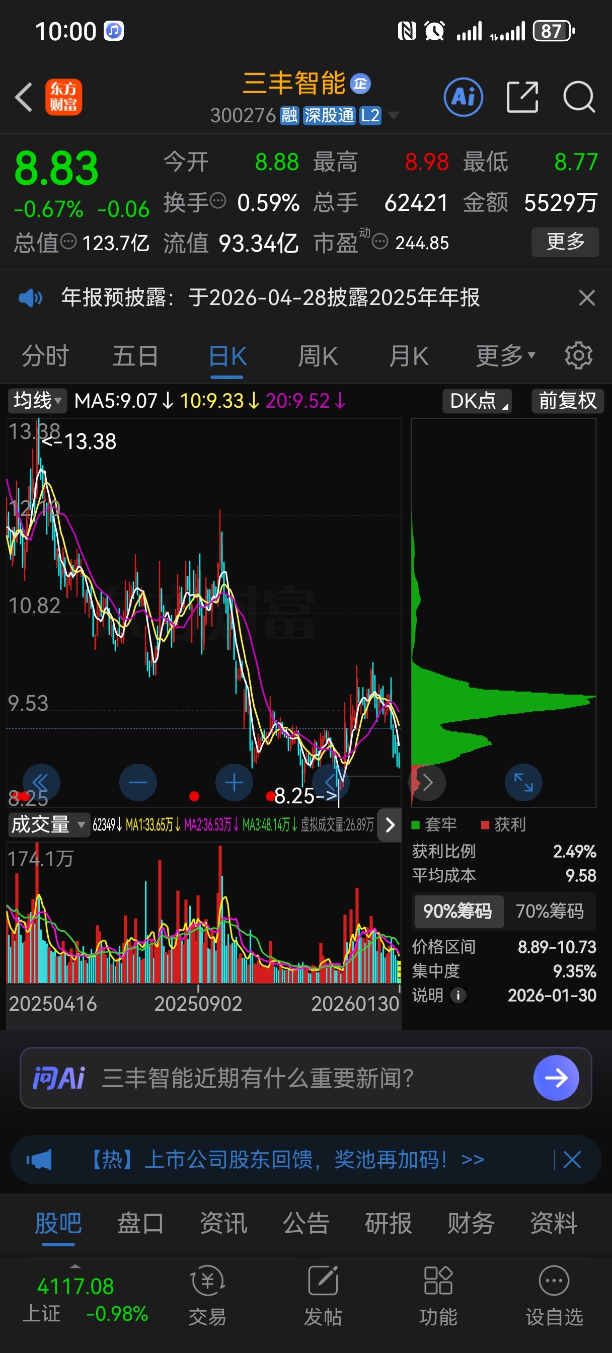 $三丰智能(SZ300276)$ 说过了不要被量化诱多,上当受骗。远离量化操盘股,远离股东减持股。日k线楔形下跌,必定会必须下跌至2月中旬。6-7块的区间肯定能达到,那个时候主力吸筹够了,必定会有一波小高潮拉高出货,等待2月中旬见底再加仓。一定要理智,祝大家发财!!!