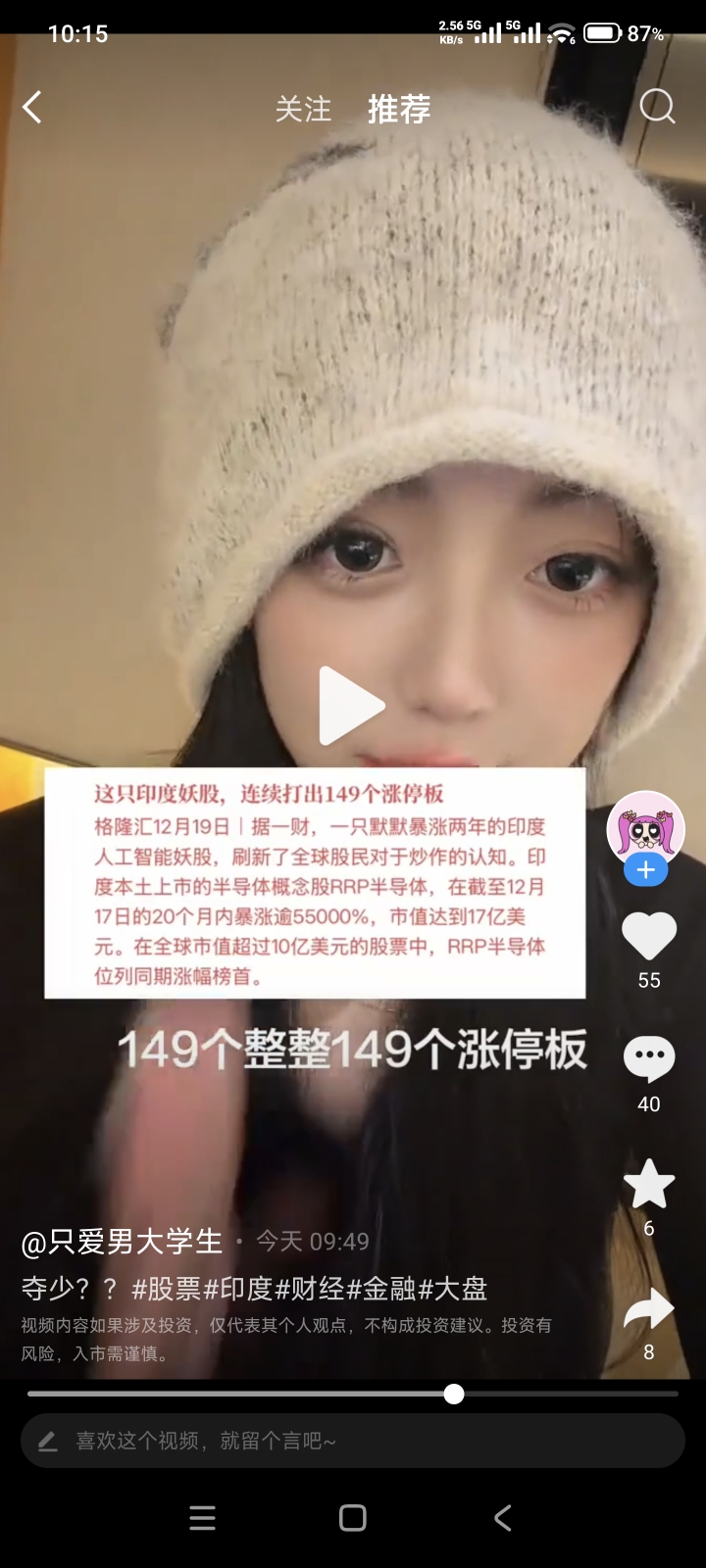 听说印度股市84900点,有支科技股票连涨149个涨停板!