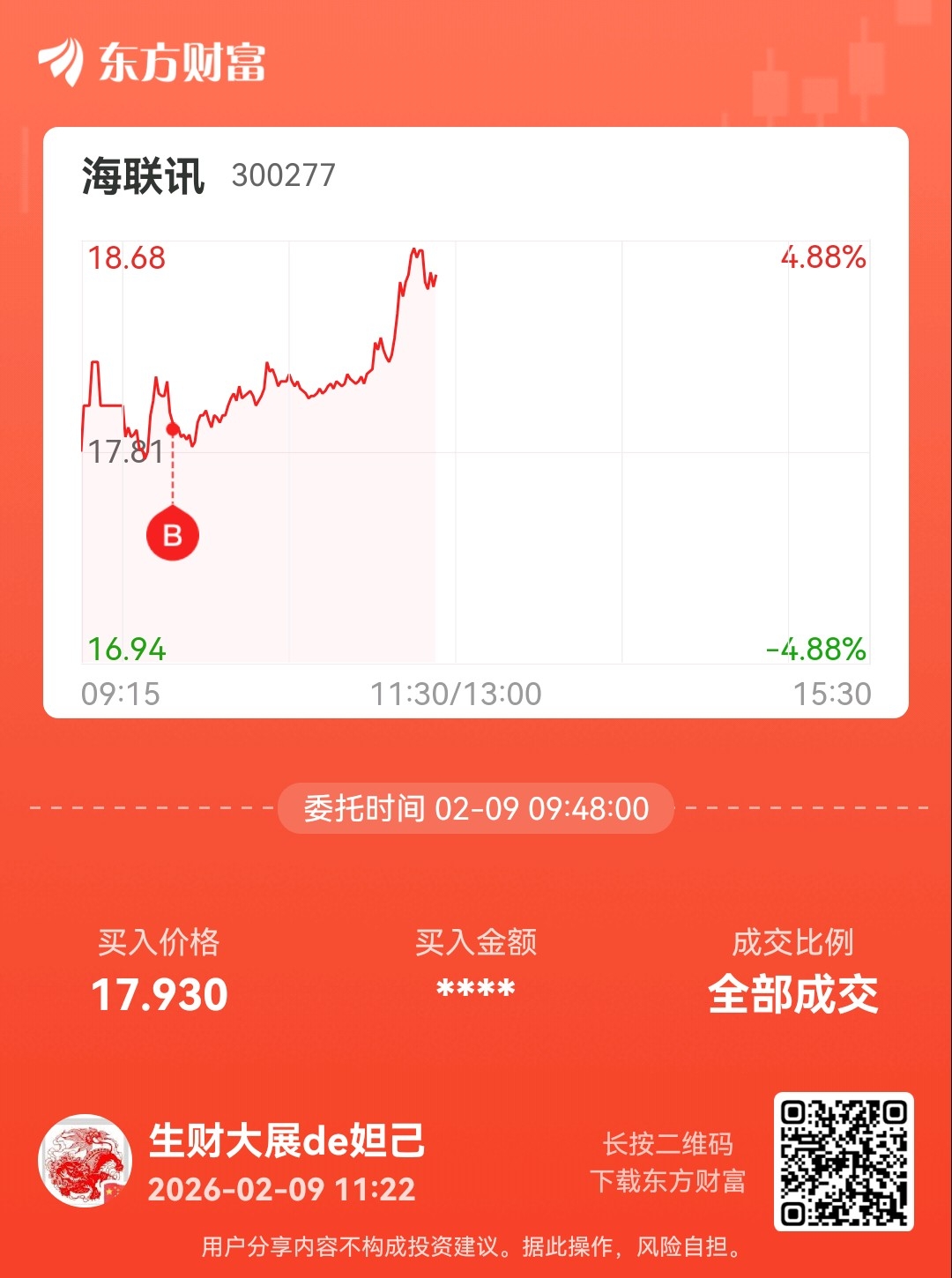温馨提示: 1.根据《证券法》规定,禁止编造、传播虚假信息或者误导性信息,扰乱证券市场;2.用户在本社区发表的所有资料、言论等仅代表个人观点,与本网站立场无关,不对您构成任何投资建议。用户应基于自己的独立判断,自行决定证券投资并承担相应风险。《东方财富社区管理规定》
