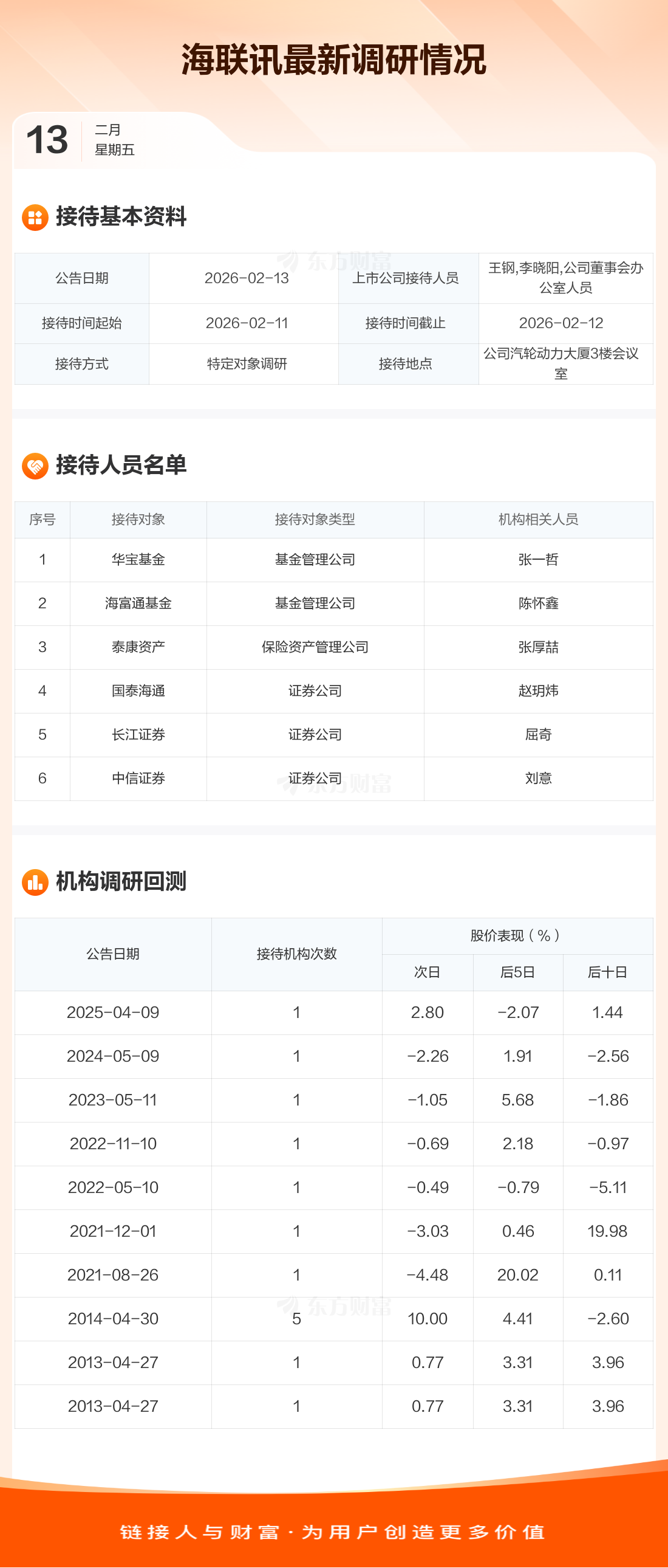 海联讯2月13日公告称,2月11日至2月12日接待华宝基金等6家机构调研。接待人员包括王钢,李晓阳,公司董事会办公室人员。