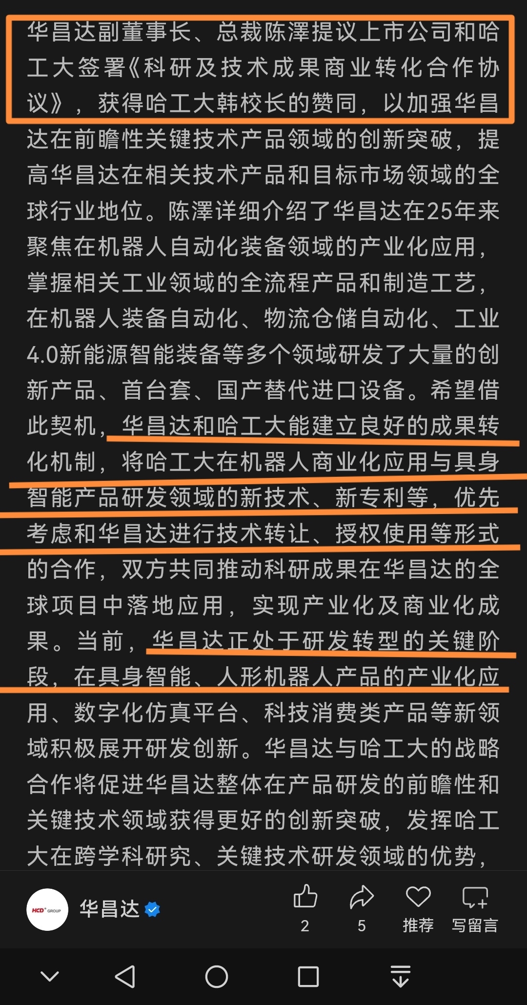 $华昌达(SZ300278)$ 看来华昌达没多少散户关注了,高新投董事长带着陈泽去哈工大,很明显就是为了华昌达和哈工大合作而去的,华昌达的股友不激动,反而看着一个不太相关的退市企业工新5很多股友yy起来了。