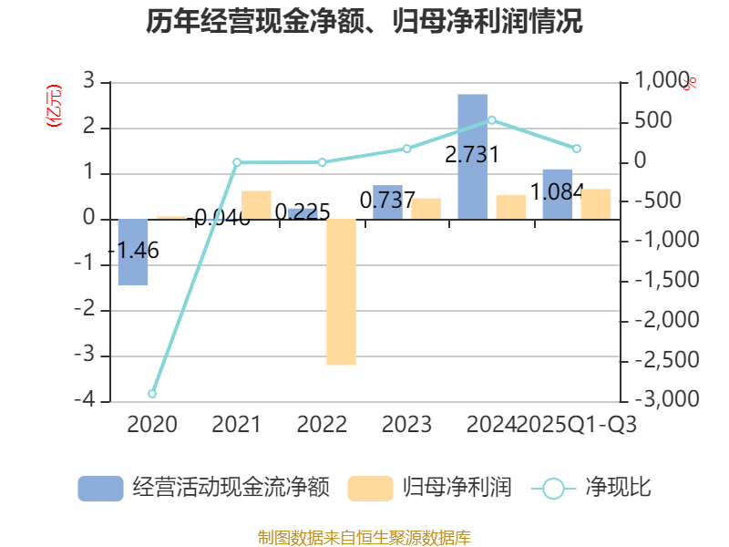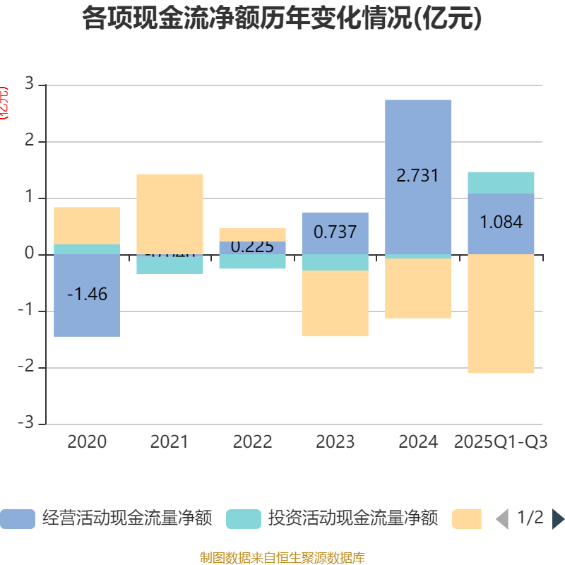 2025年前三季度,公司经营活动现金流净额为1.08亿元,同比下降32.58%;筹资活动现金流净额-2.1亿元,同比减少2.33亿元;投资活动现金流净额3689.65万元,上年同期为-2857.36万元。