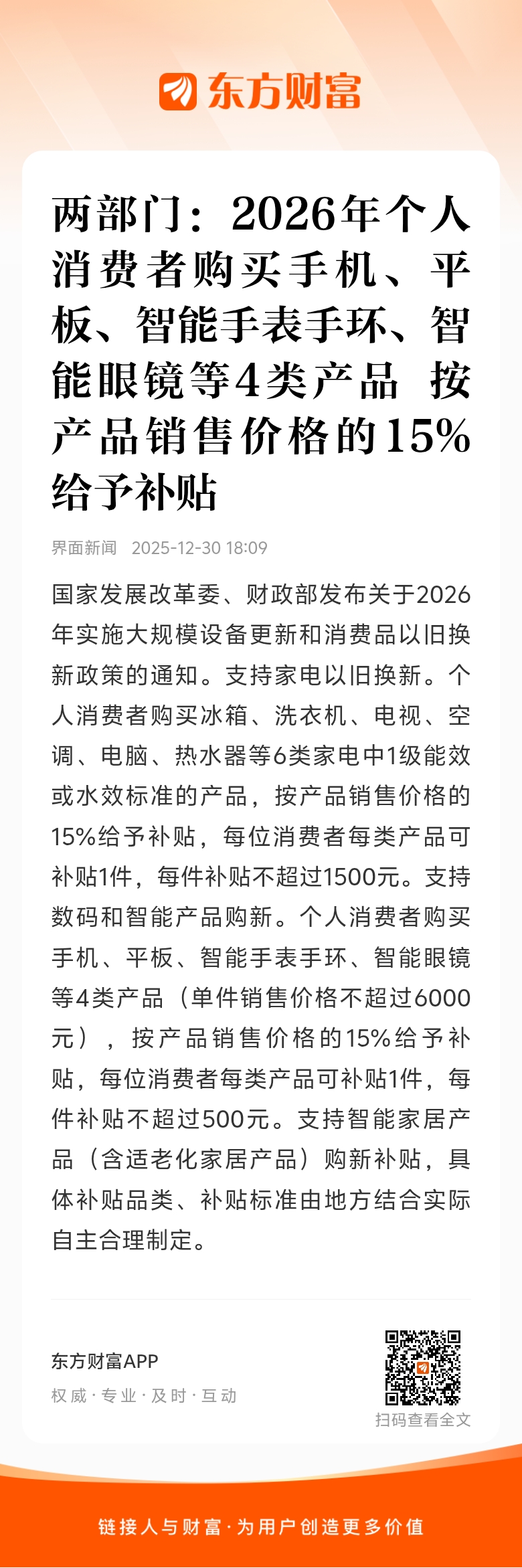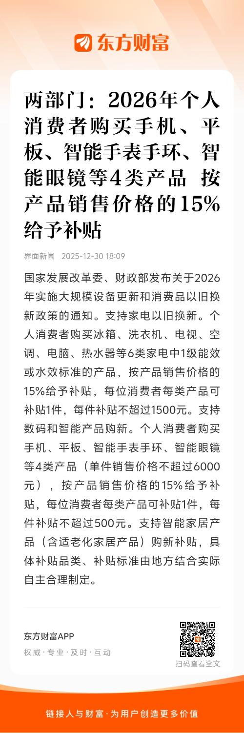 国家发展改革委、财政部发布关于2026年实施大规模设备更新和消费品以旧换新政策的通知。支持家电以旧换新。个人消费者购买冰箱、洗衣机、电视、空调、电脑、热水器等6类家电中1级能效或水效标准的产品,按产品销售价格的15%给予补贴,每位消费者每类产品可补贴1件,每件补贴不超过1500元。支持数码和智能产品购新。个人消费者购买手机、平板、智能手表手环、智能眼镜等4类产品(单件销售价格不超过6000元),按产品销售价格的15%给予补贴,每位消费者每类产品可补贴1件,每件补贴不超过500元。支持智能家居产品(含适老化家居产品)购新补贴,具体补贴品类、补贴标准由地方结合实际自主合理制定。