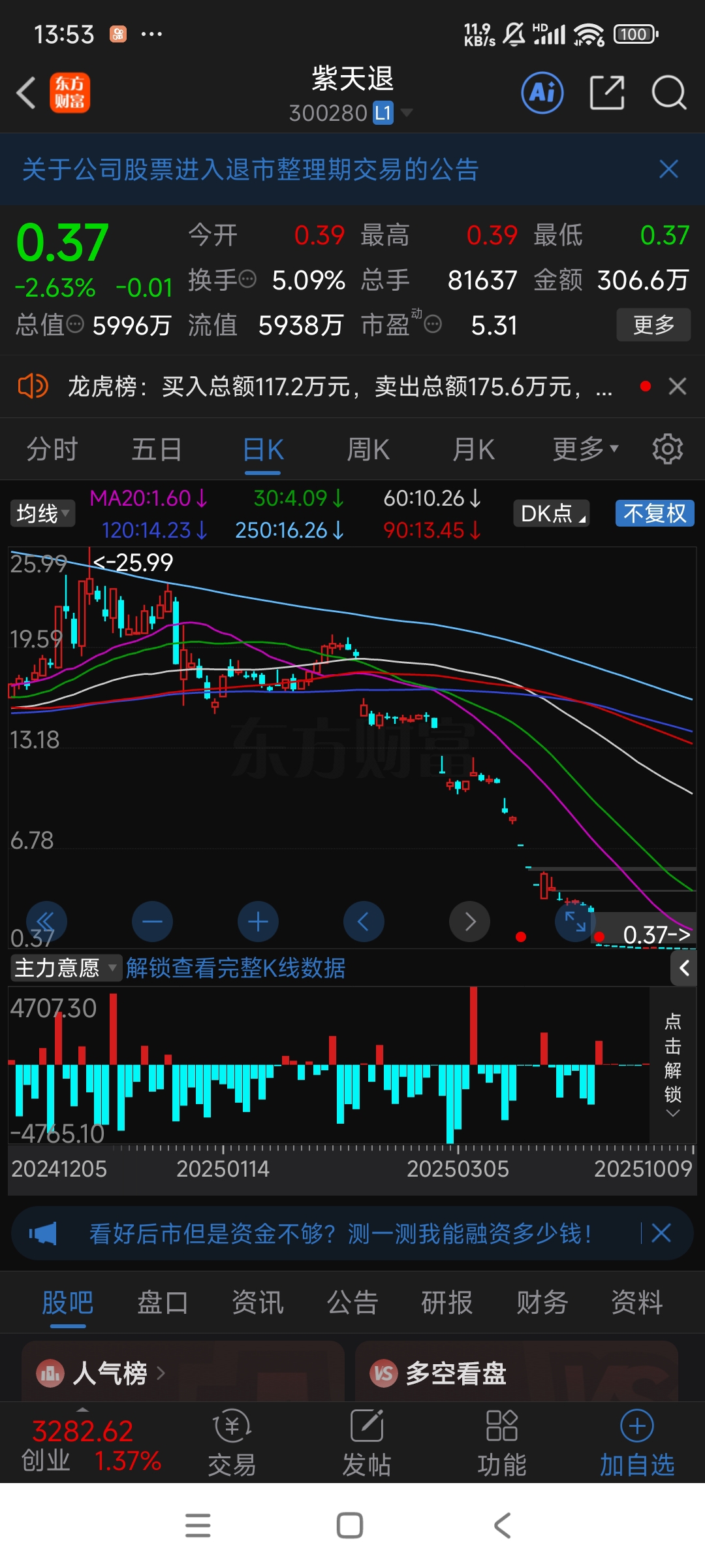 $紫天退(SZ300280)$ 25.99跌到0.37真的太狠了