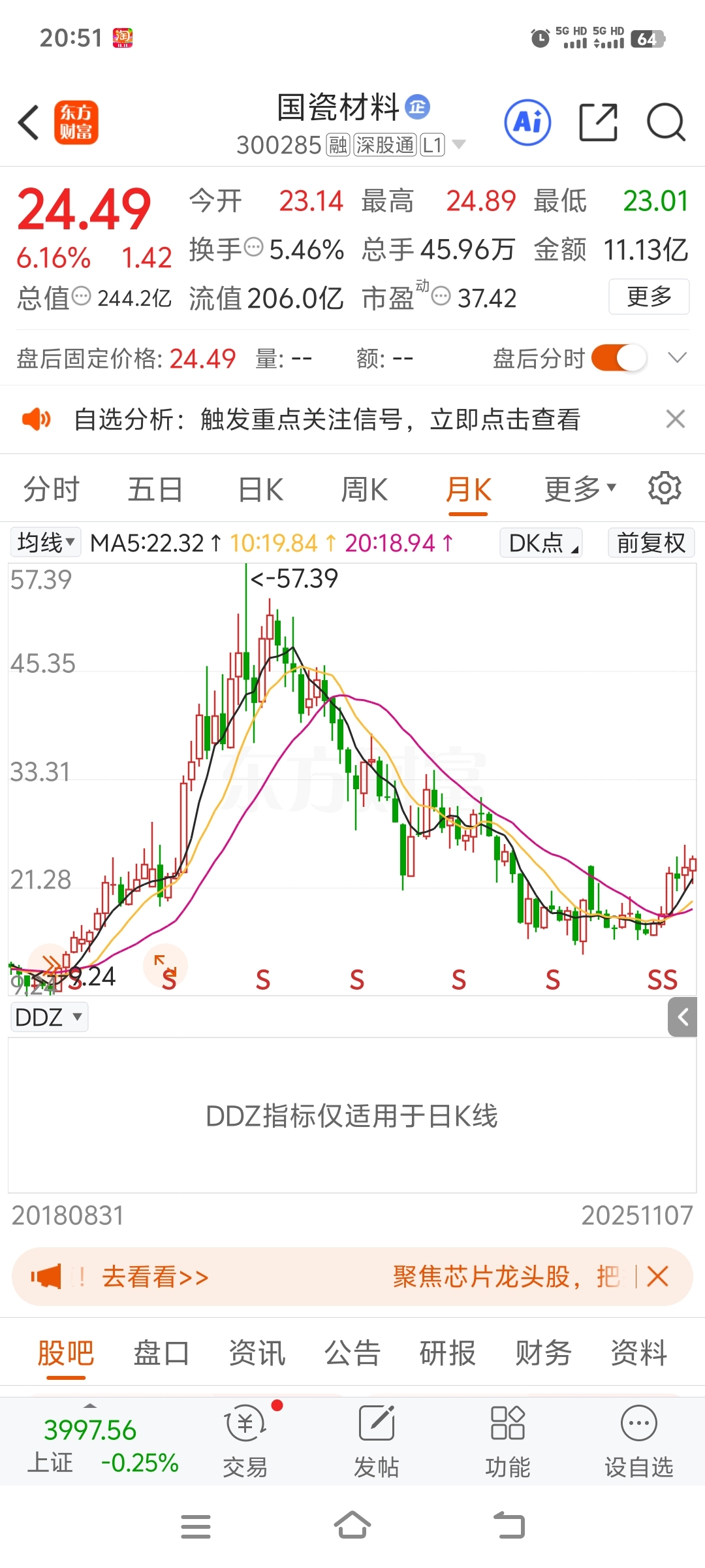 $国瓷材料(SZ300285)$ 月线还在底部。第一目标30元!预计11月底让董事会提高回购价