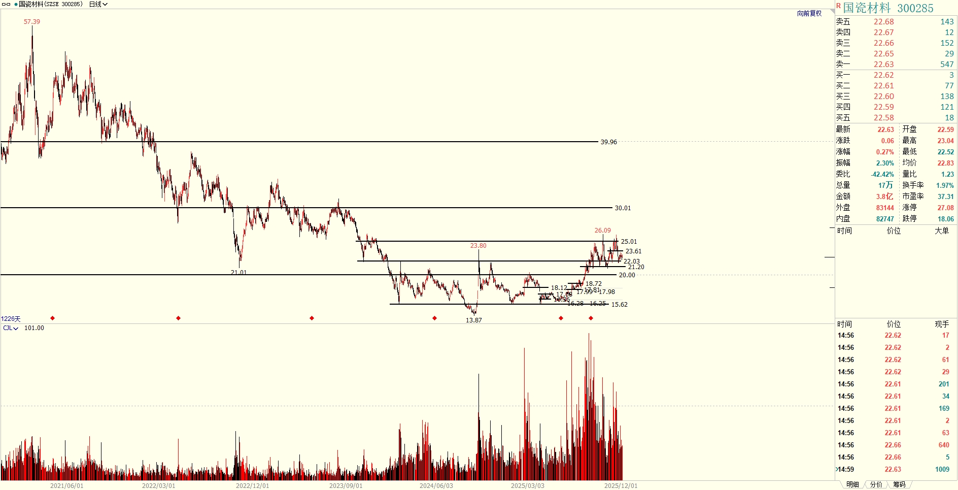 一把直尺打天下/国瓷材料15-22之间大规模头肩底,趋势目标44;现阶段,股价集
