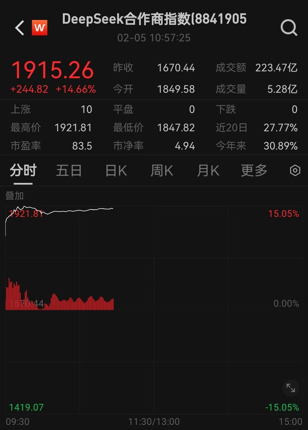2月5日,A股DeepSeek概念股集体大涨,截至发稿,DeepSeek合作商指数上涨超14%。