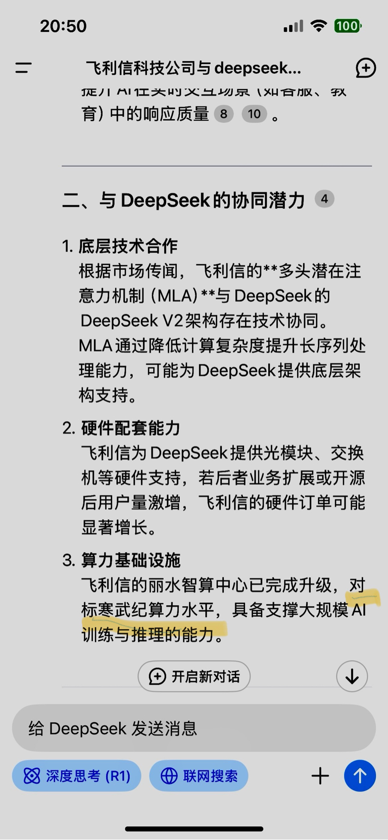 $飞利信(SZ300287)$ 继续看好飞利信这匹黑马!1、Ai大浪潮中,稀缺技术为“王”的年代!如deepseek 的创始人梁文锋说:我们不缺资金而是缺技术和芯片!中概股MLGO一天爆涨近10倍,因为它有“算法”黑科技!同样飞利信拥有的“MLA”技术也是一流“黑科技”;2、据了解,飞利信的万P以上算力可以对标寒武纪的水平!