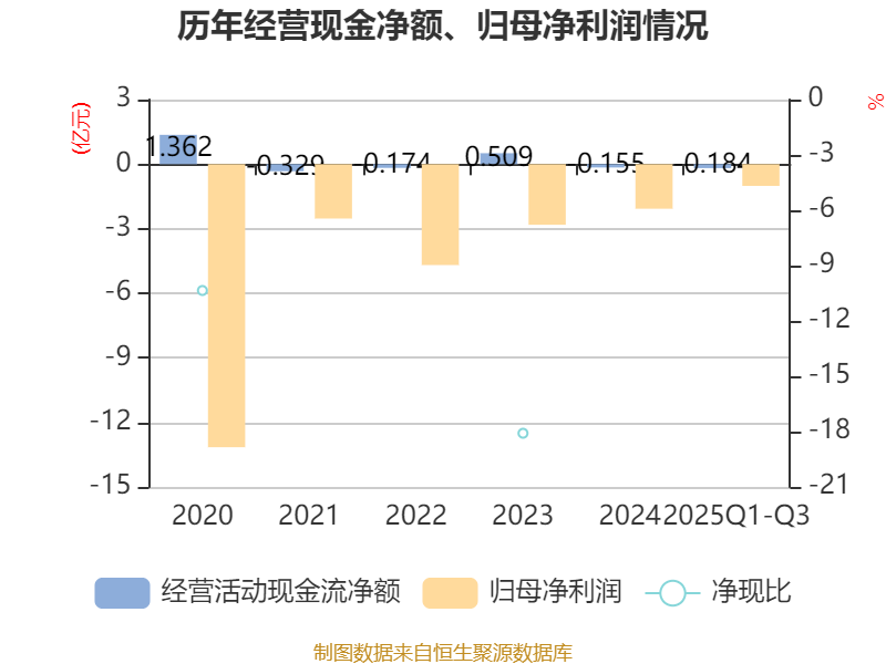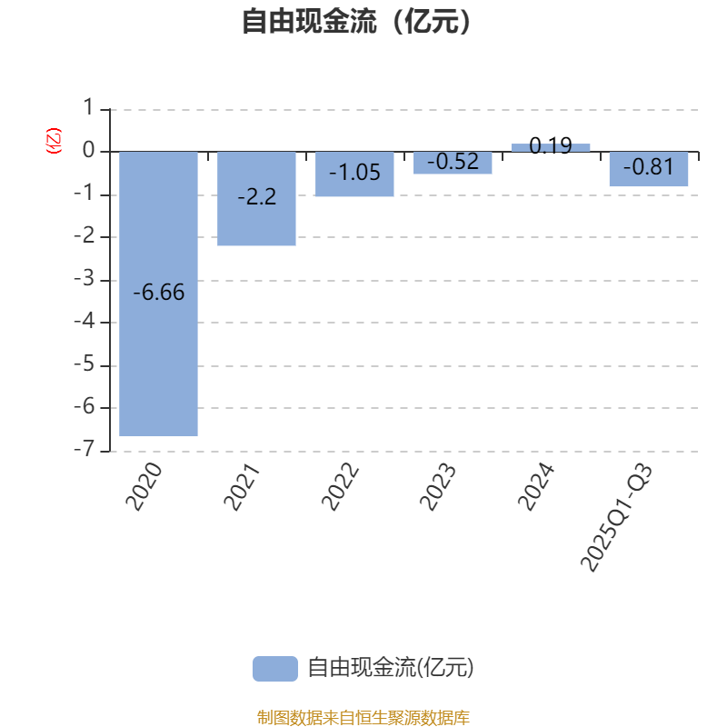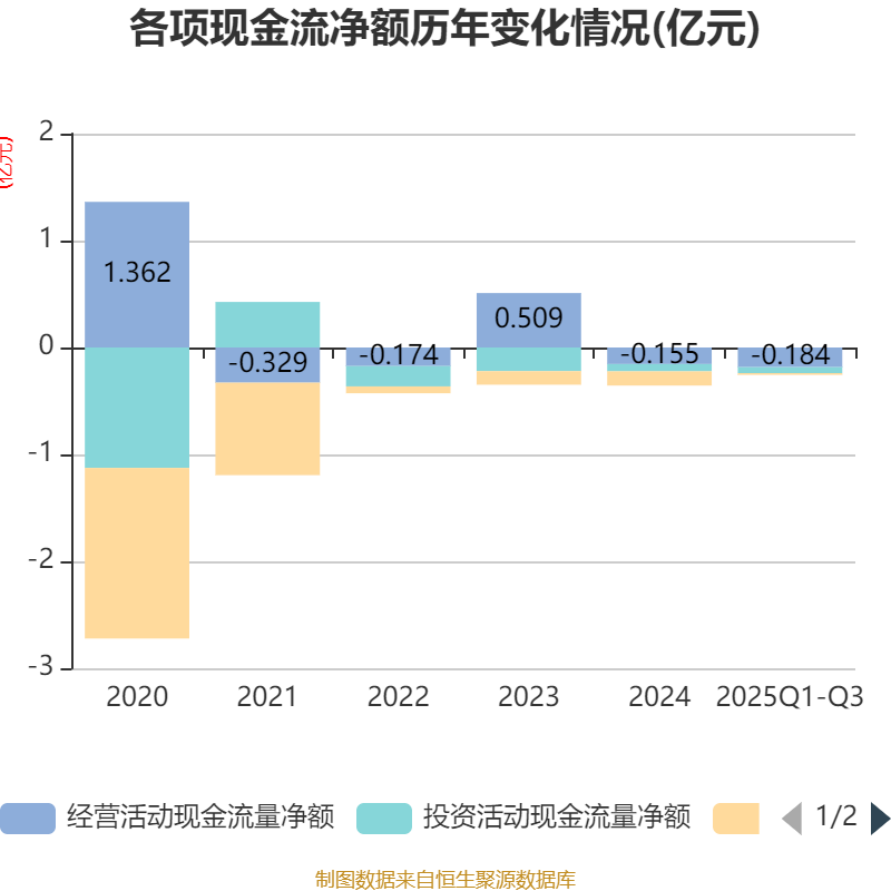 2025年前三季度,公司经营活动现金流净额为-1839.93万元,同比增加3580.61万元;筹资活动现金流净额-156.53万元,同比增加908.78万元;投资活动现金流净额-557.48万元,上年同期为-588.7万元。