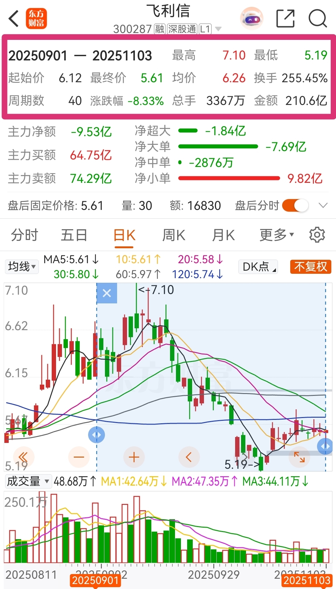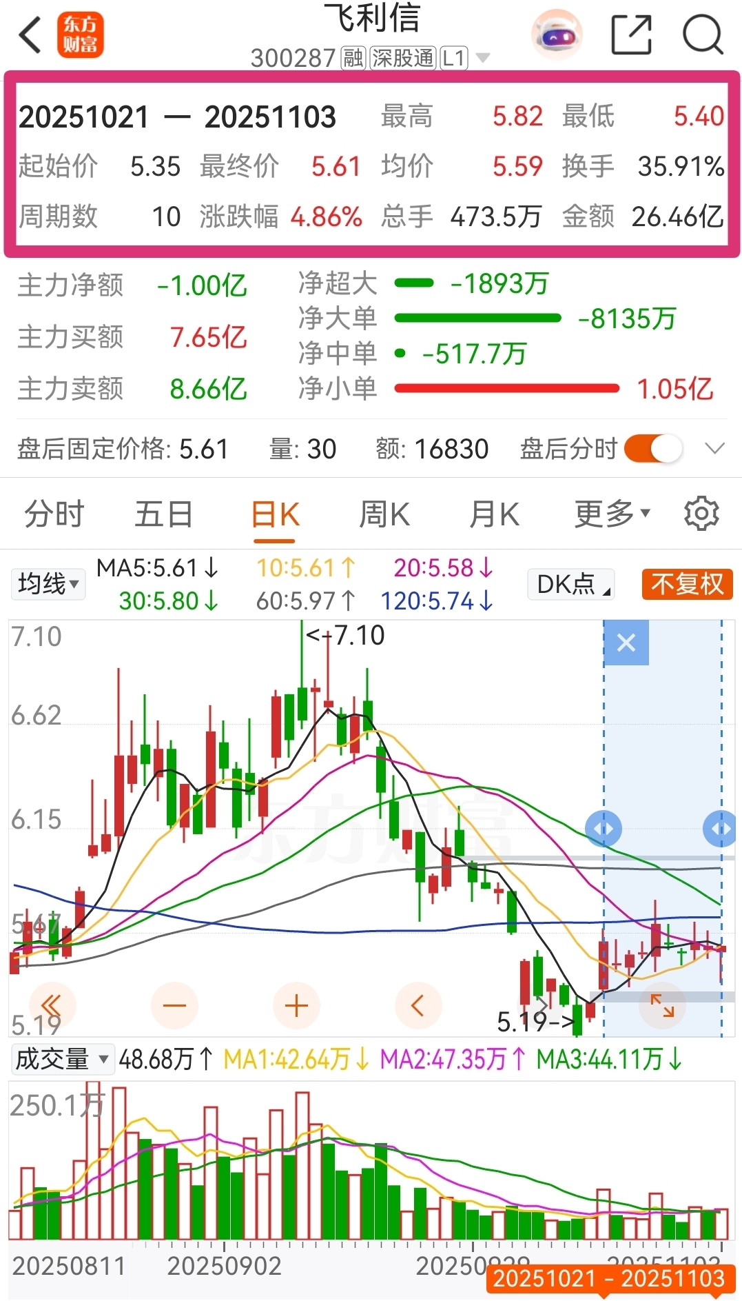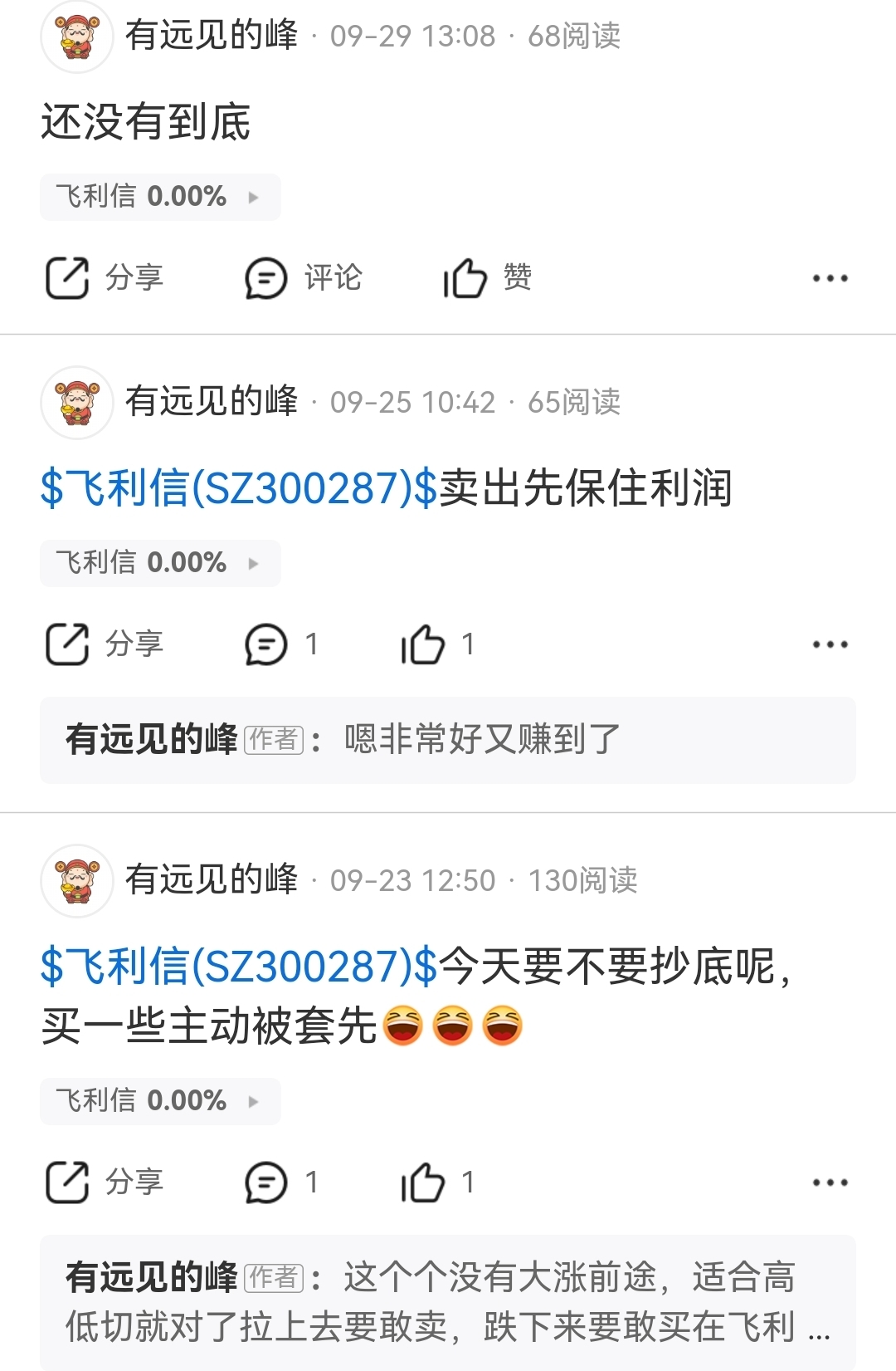 $飞利信(SZ300287)$ 老鲨鱼出入飞利信N多次了!历来都是打短差,从来都不相信股吧里有股神(棍)或者砖家叫兽!涨凶了必须卖!在相对的底部,跌凶了别恐惧,抓住机会逢低买入待涨为上策!哪里像那些又装【表仔又要立排方】的心机表们!互联网是有记忆的!自己买入卖出难道没有主见?凭什么买?凭啥又卖?皆为利来!多多参考学习老鲨鱼发的下面几幅区间交易的详细数据截图吧!继续!