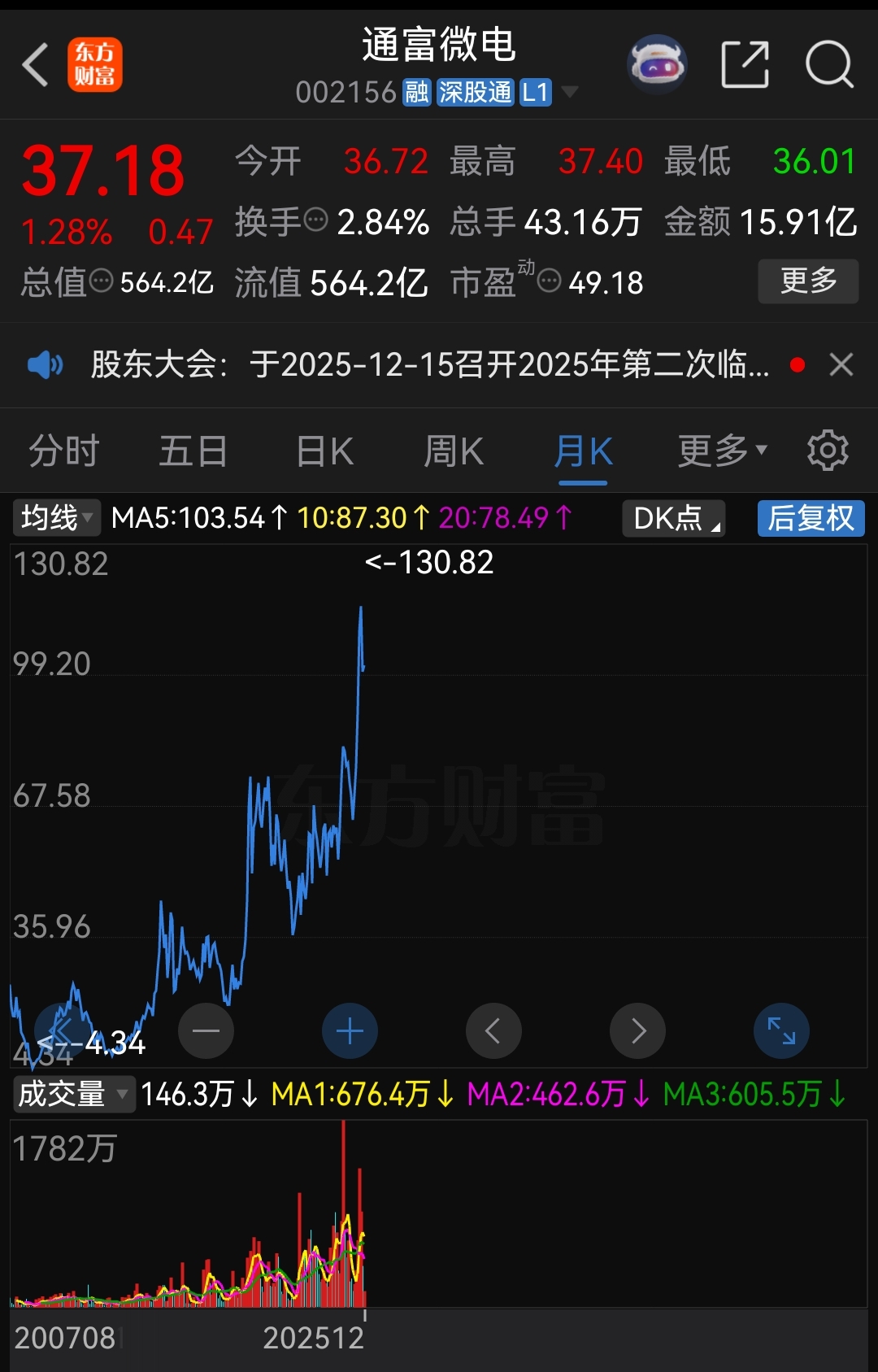 通富微电老鲨鱼曾中了二签新股(持三个帐户),当初如果没卖!130-4.34=12