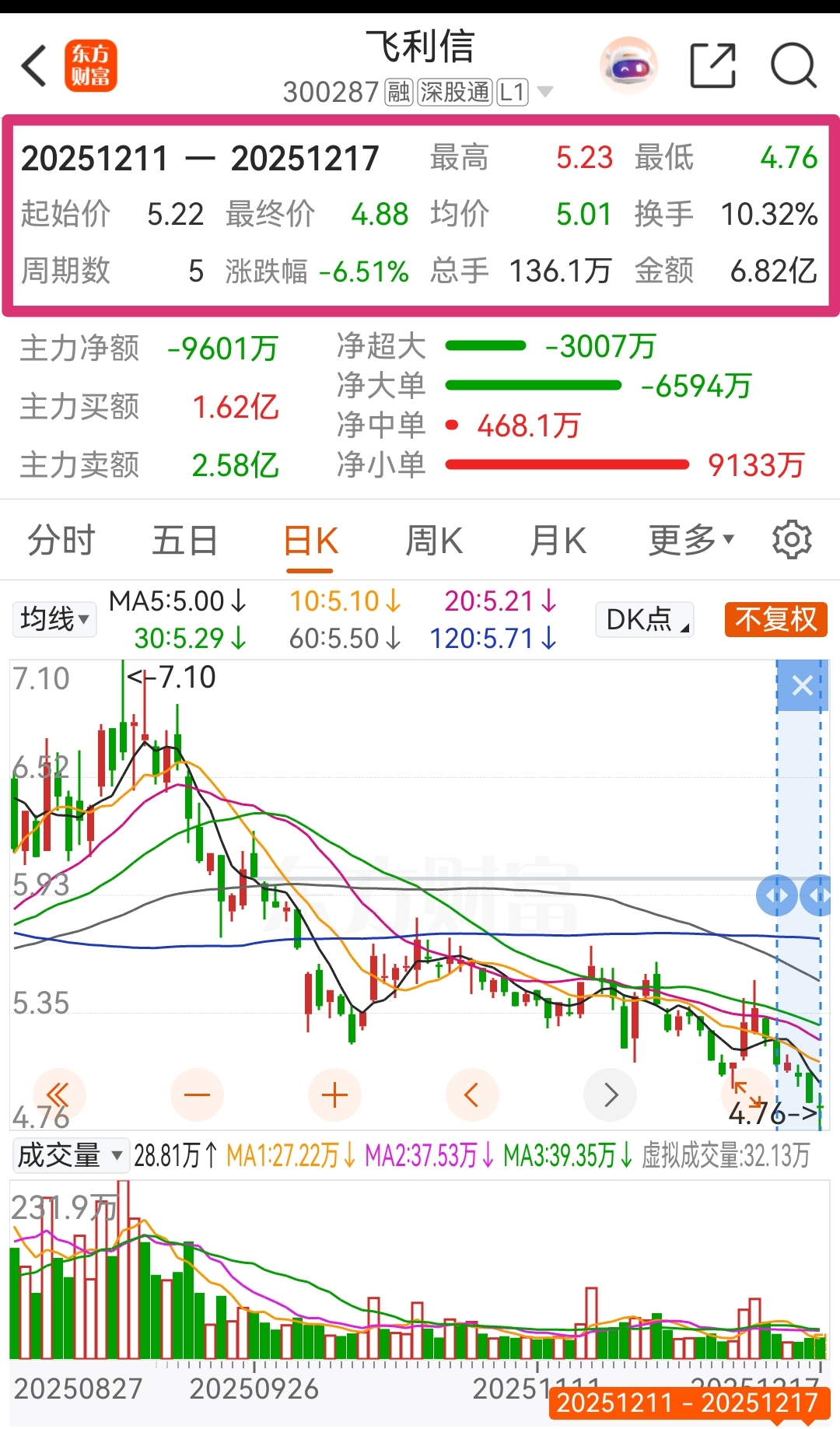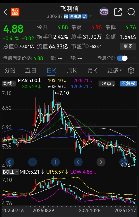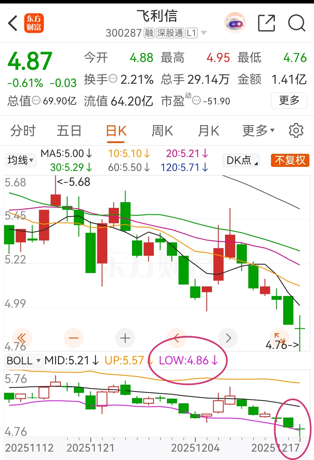 飞利信今天最低价4.76元再次击穿BOLL线下轨4.86元!昨天收盘4.90元,