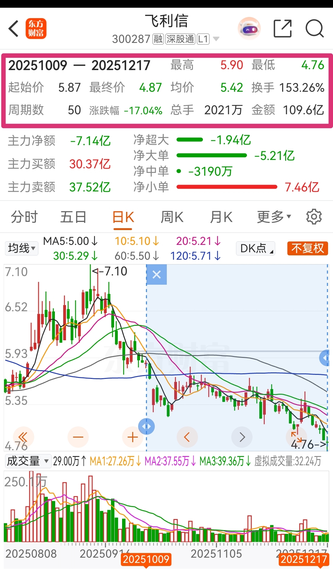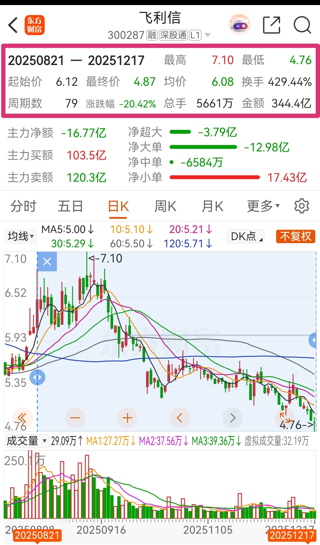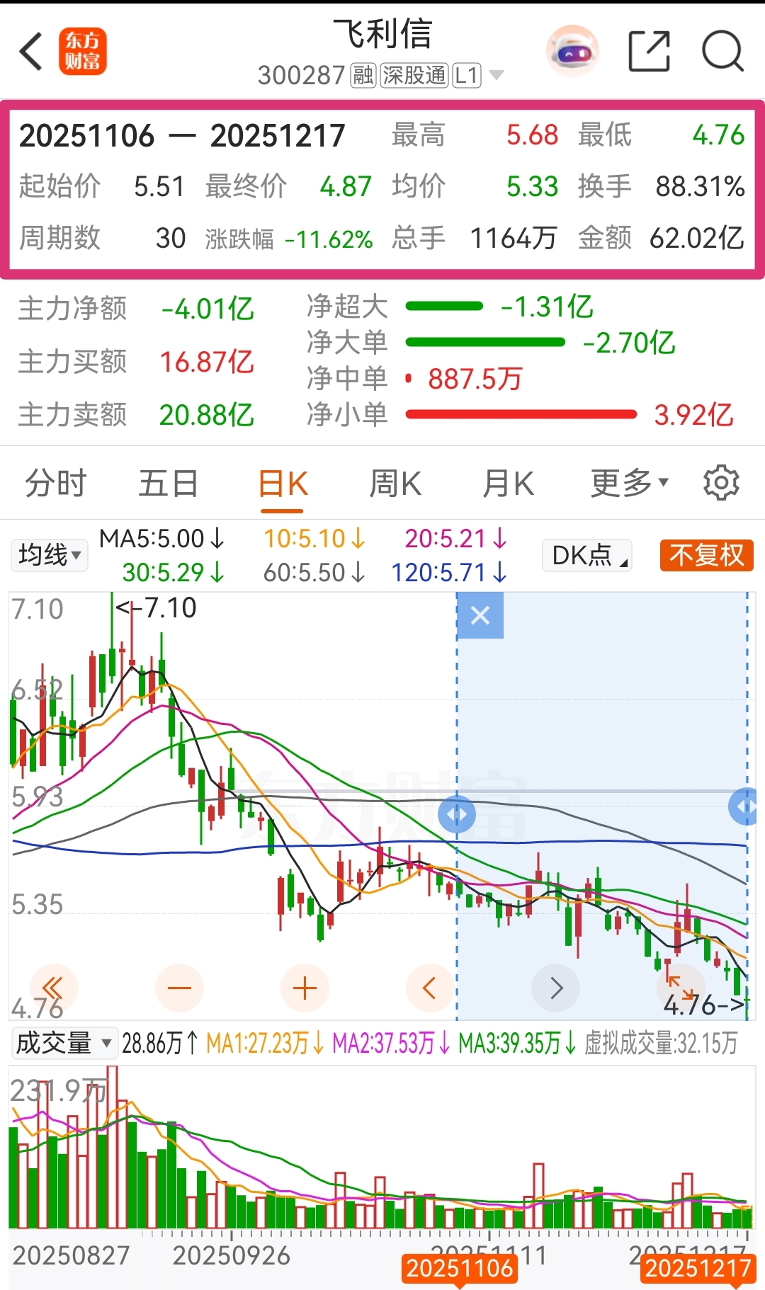飞利信今天最低价4.76元再次击穿BOLL线下轨4.86元!昨天收盘4.90元,