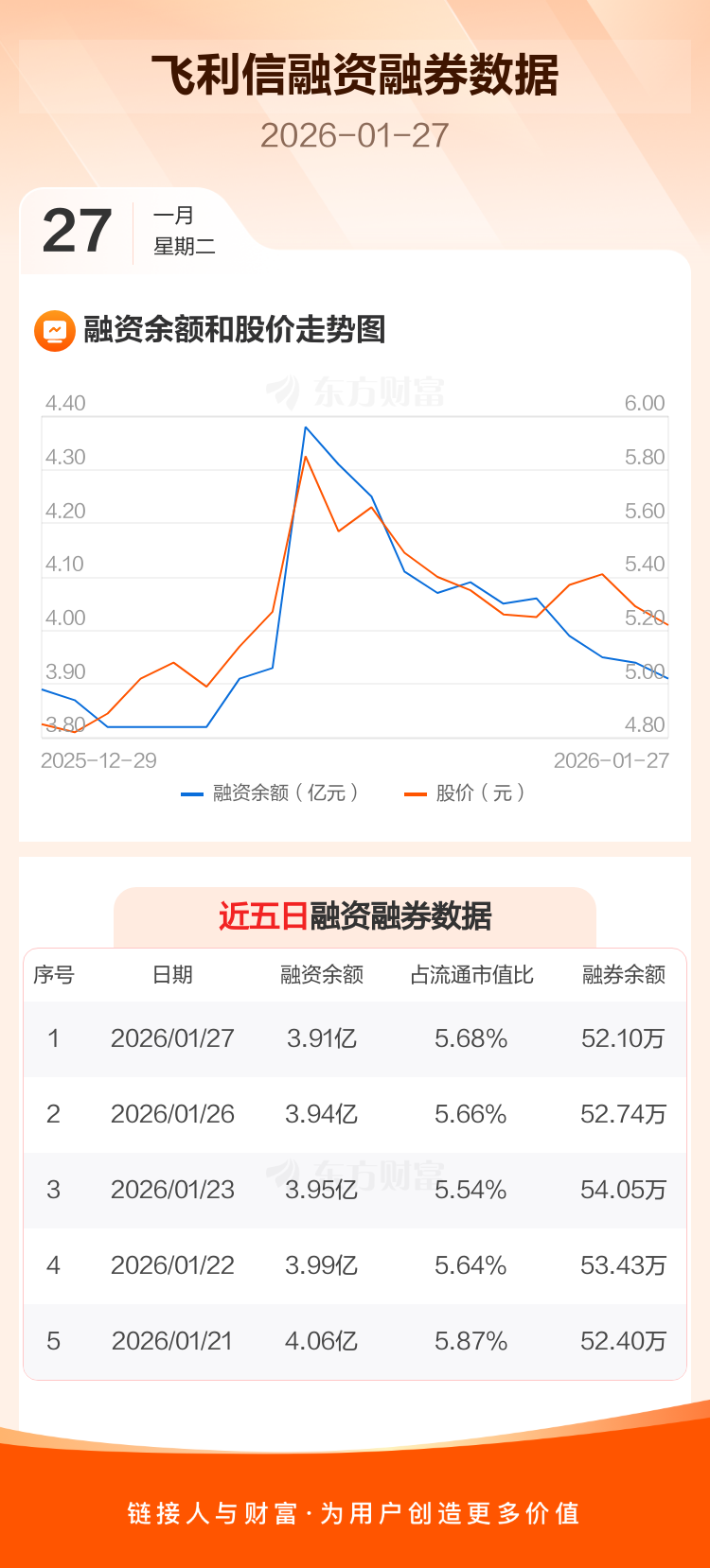交易所最新数据显示,飞利信于2026年1月27日获融资买入866.35万元,融资偿还1232.98万元,当日融资净偿还366.62万元。目前,该股融资余额3.91亿,占流通市值比例为5.68%。