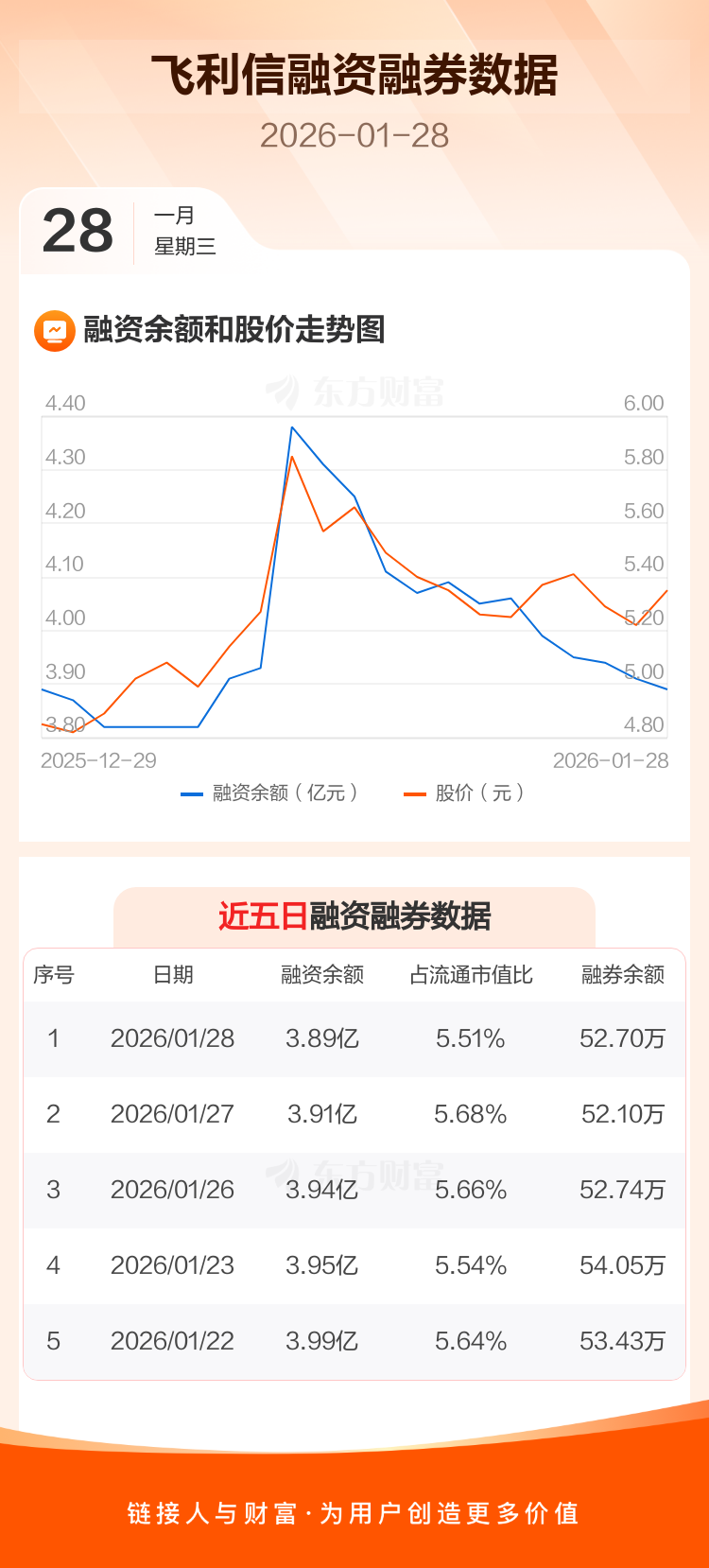 交易所最新数据显示,飞利信于2026年1月28日获融资买入1388.25万元,融资偿还1597.79万元,当日融资净偿还209.54万元。目前,该股融资余额3.89亿,占流通市值比例为5.51%。