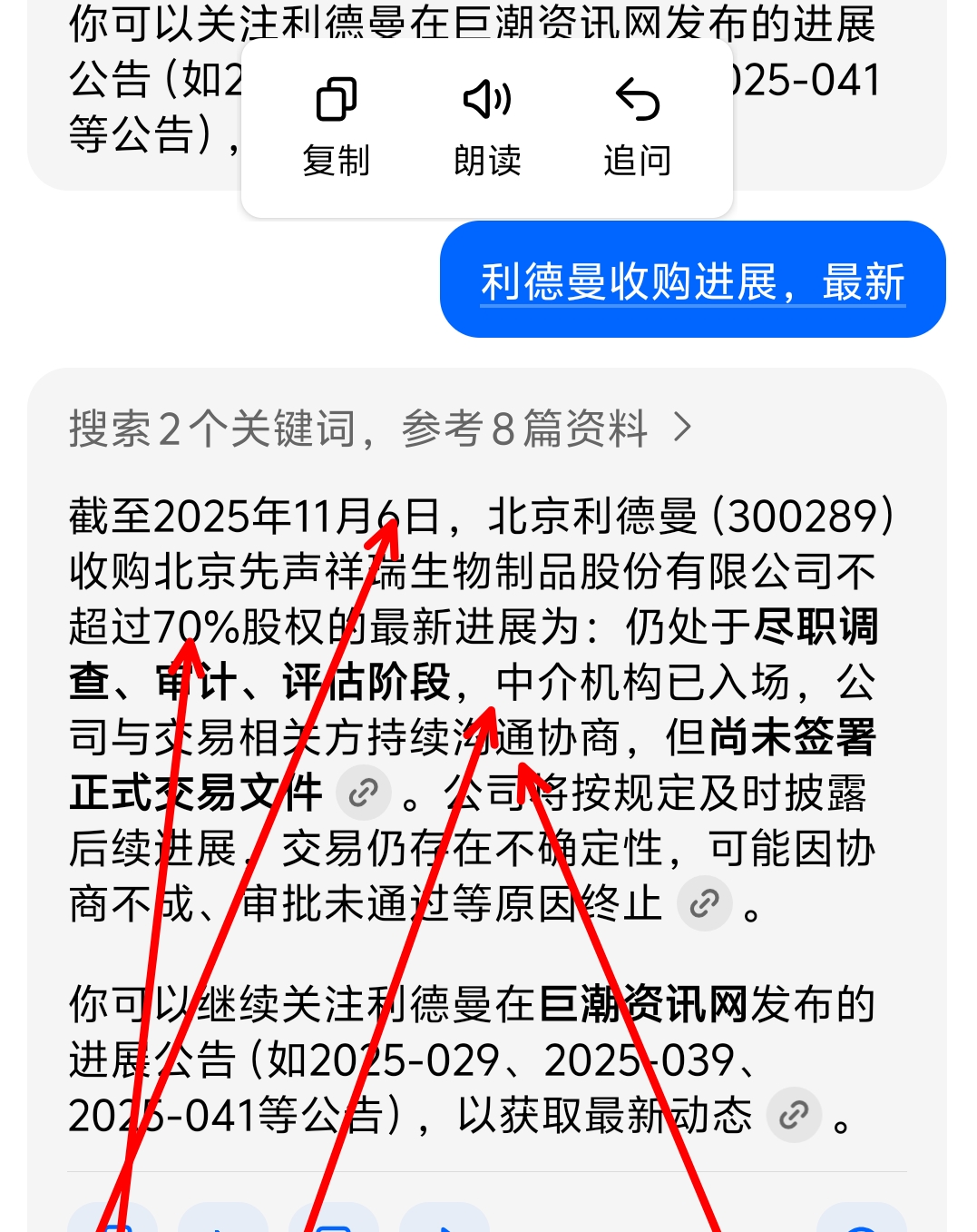 $利德曼(SZ300289)$ 11月6日利德曼重大资产重组收购北京先声祥瑞生物制品股份有限公司不超过70%股权的最新进展为:仍处于尽职调查、审计、评估阶段。