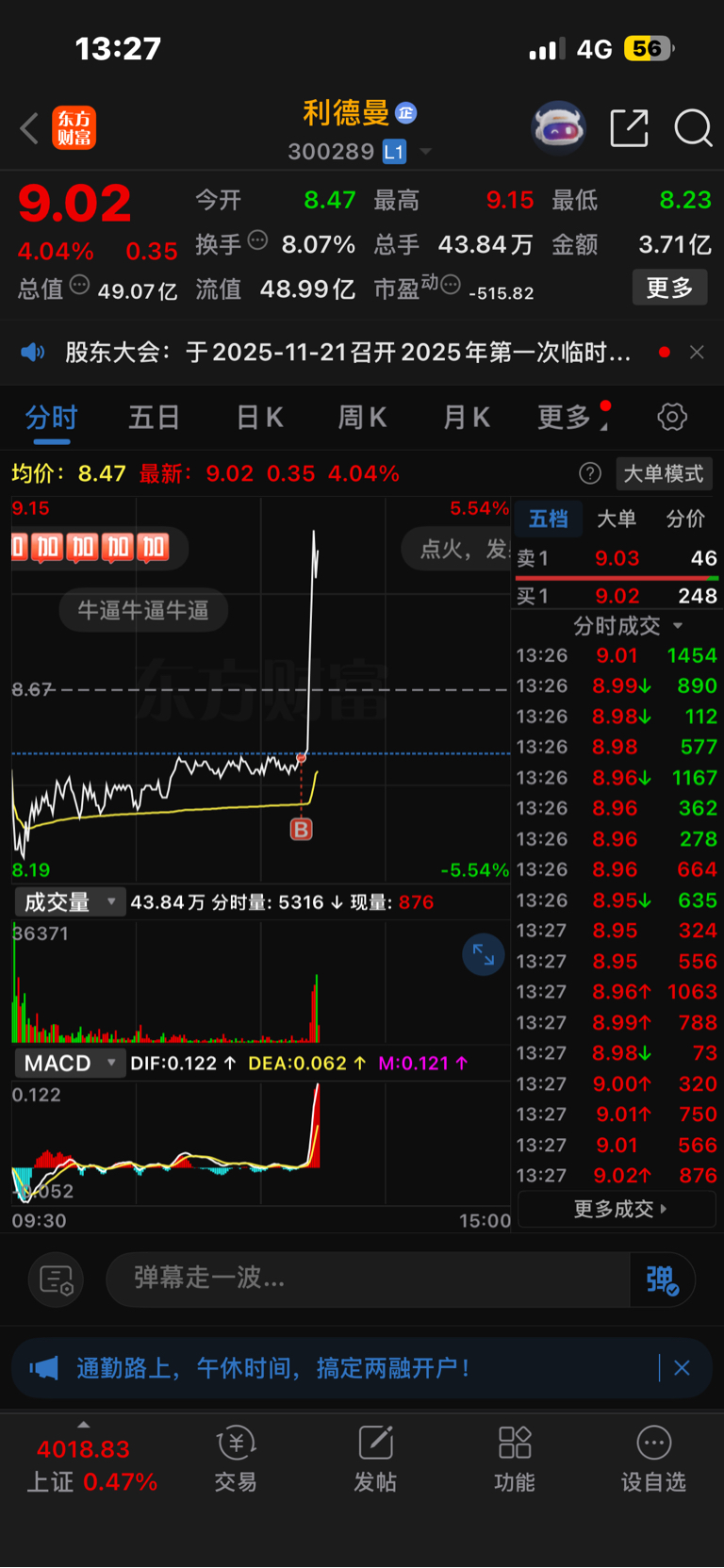 $利德曼(SZ300289)$ 8.5买了3成,