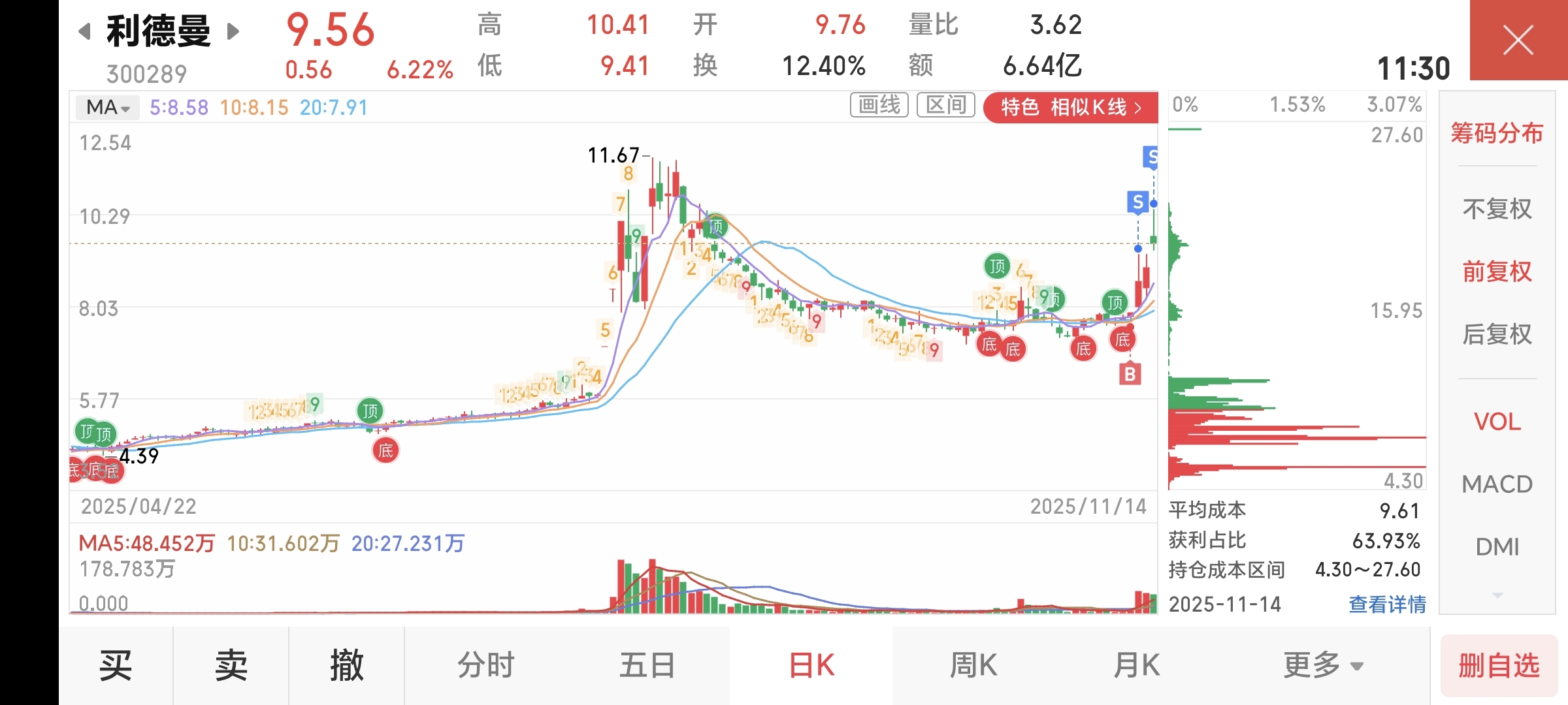 $利德曼(SZ300289)$ 只能说运气还可以,前天最高出半仓,今天差不多高点清掉了,如果昨天上午低吸就不是运气而是实力了