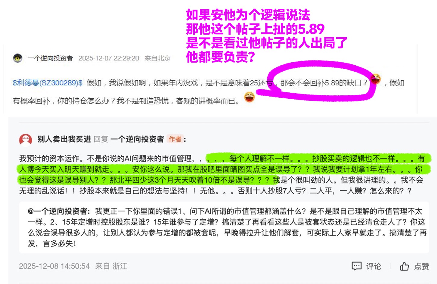 有些人说话就是不会换换思考,我今天随便跟它沟通了一下市值管理,说原来的大股东定增亏了十年了没出。这不也是个人的预测嘛。他就较真了,然后跟他讲什么理都没用了。。安他这个逻辑,他这帖子上提到的5.89是不是他也得负责?这不纯粹的瞎叫嘛。。。看看他2017年在盐湖股吧里面的帖子,我就知道,它可能平时横习惯了!!!!(不要觉得讲理讲不过就乱咬!!我所有的帖子全是有理有据的!)
