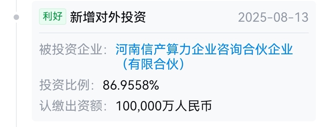 看这张图,洛阳煜联投资河南信产算力10亿元,占87%股份,说明二者是一体的,进出只是为了清理股权。另外河南信产算力总资本11亿多,应该是等待入股的,跟东方明珠的投资规模差不多。