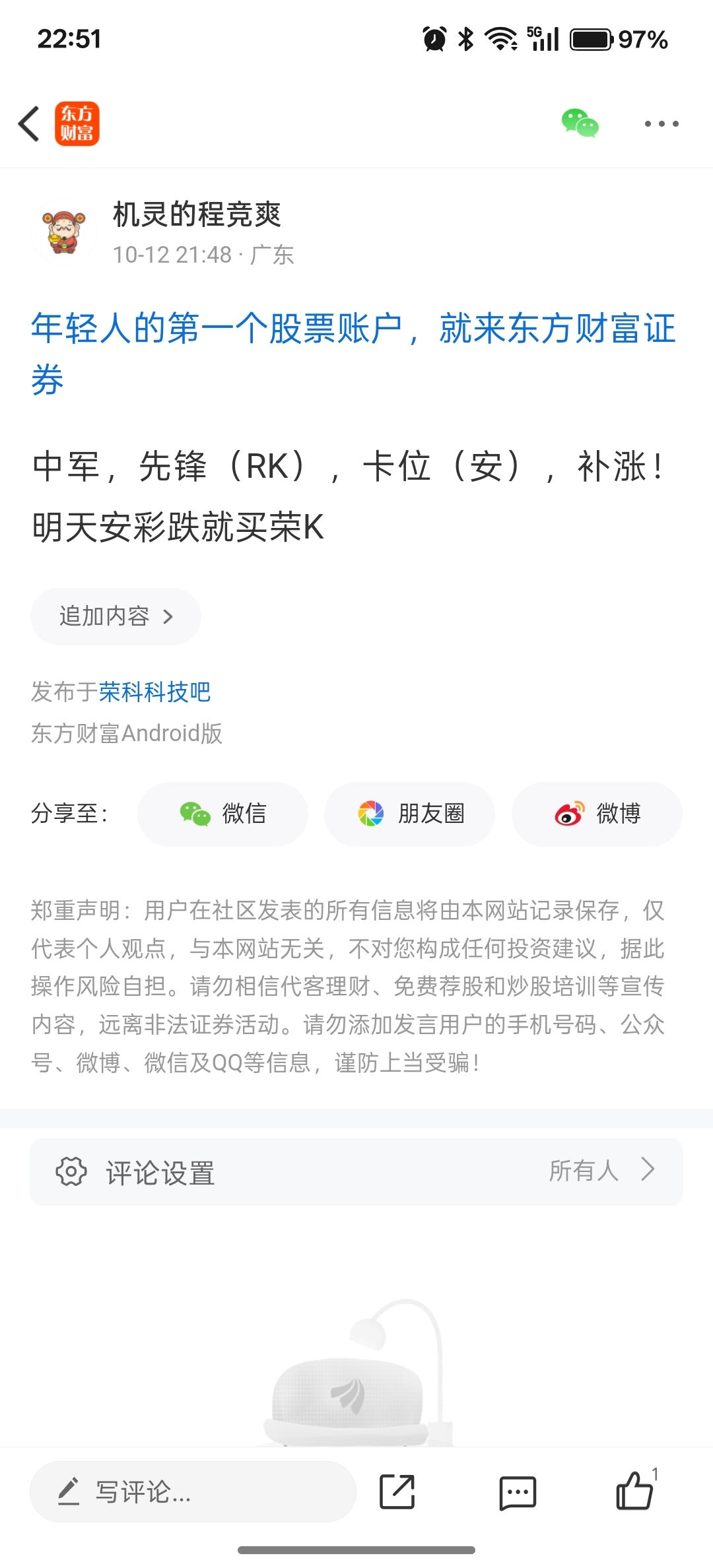 温馨提示: 1.根据《证券法》规定,禁止编造、传播虚假信息或者误导性信息,扰乱证券市场;2.用户在本社区发表的所有资料、言论等仅代表个人观点,与本网站立场无关,不对您构成任何投资建议。用户应基于自己的独立判断,自行决定证券投资并承担相应风险。《东方财富社区管理规定》