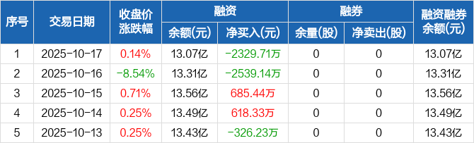 荣科科技:融资净偿还2329.71万元,融资余额13.07亿元(10-17)
