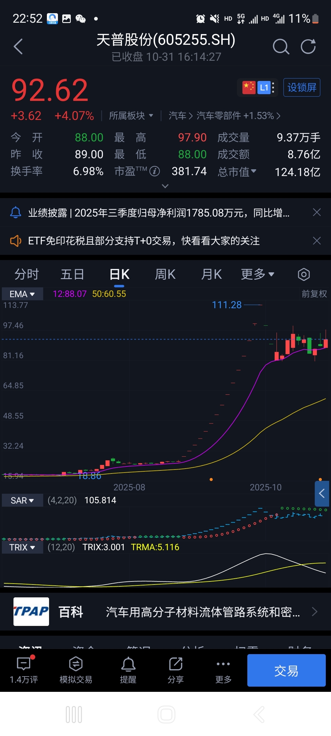 我卖飞的牛股不要太多。天普股份曾经买过,没拿住。要不然早就赚一个小目标了。