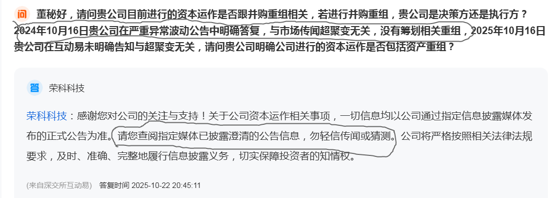 现在最关键的是董秘10月多次对超聚变重组传闻回复提示过去的澄清公告。如果真的超巨变重组荣科了公司管理层及董秘就是误导操纵股价及舆论是严重的违法行为肯定会有机构或个人进行起诉。
