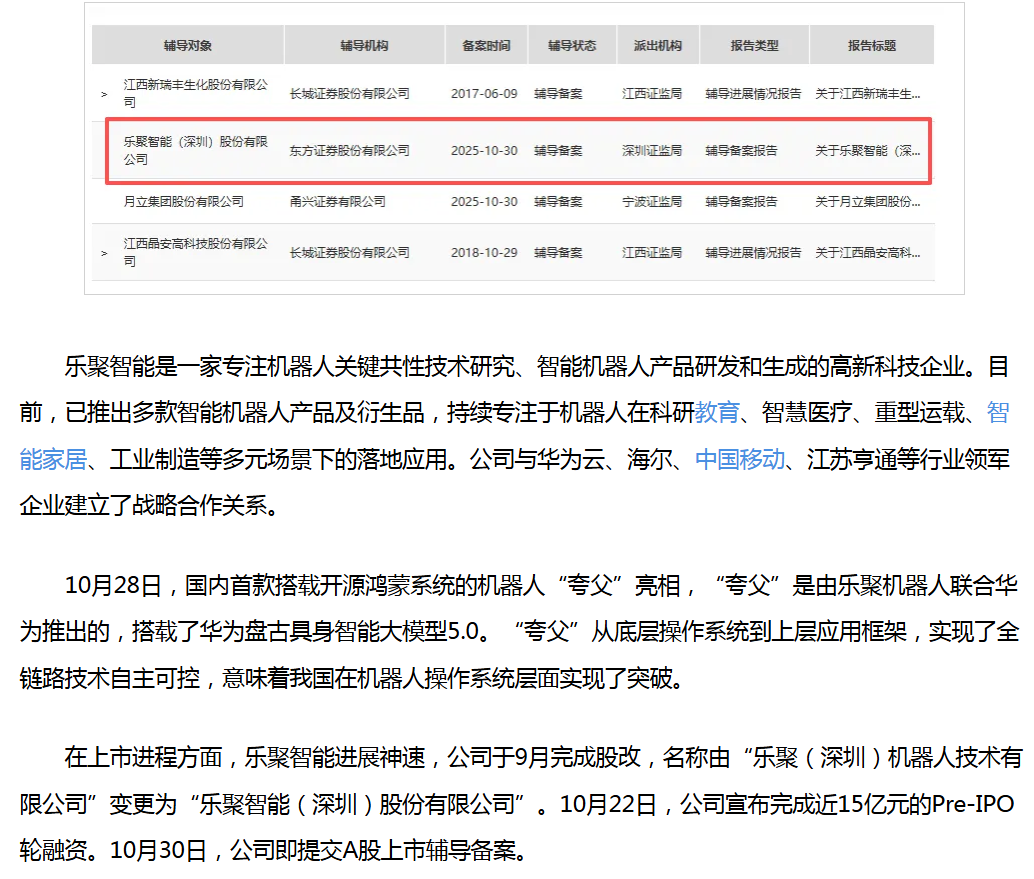乐聚智能进展神速,公司于9月完成股改,名称由“乐聚(深圳)机器人技术有限公司”变更为“乐聚智能(深圳)股份有限公司”。10月22日,公司宣布完成近15亿元的Pre-IPO轮融资。10月30日,公司即提交A股上市辅导备案,2026年3月上市辅导完成进入科创板上市申请。