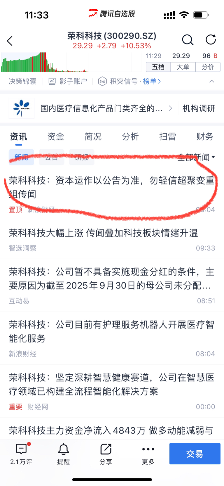 $荣科科技(SZ300290)$ 董秘这个回复还是比较有水平的,既没有否认又没有肯定,结合最近的量价异动来看,真相只有两个,第一个就是大家比较期待的东西,第二个原因呢就是股东减持拉高股价。不然没有别的理由会量价异动,不过呢,炒股这东西本身就是在不确定因素中寻找自己认为的确定点来换取自己的利益,还是那句话,见好就收,才是硬道理,大家轻点喷我