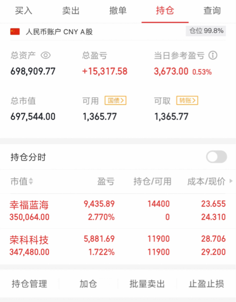 【60W炒股之旅|第7天】今日实盘操作简记:•继续持有:荣科科技卖出:买入:幸福