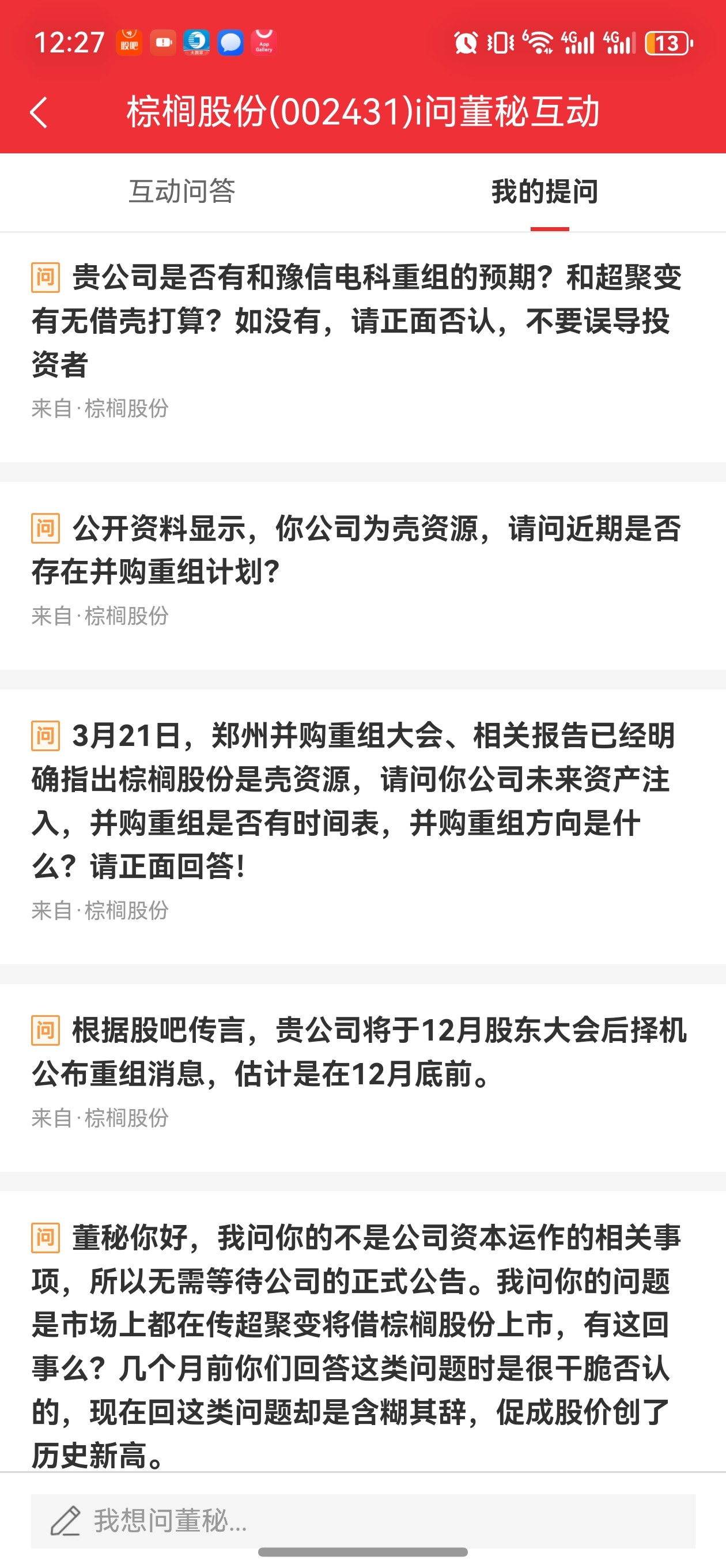 这么爱问是吧,别急,我慢慢把你们问的一条一条问一下棕榈董秘