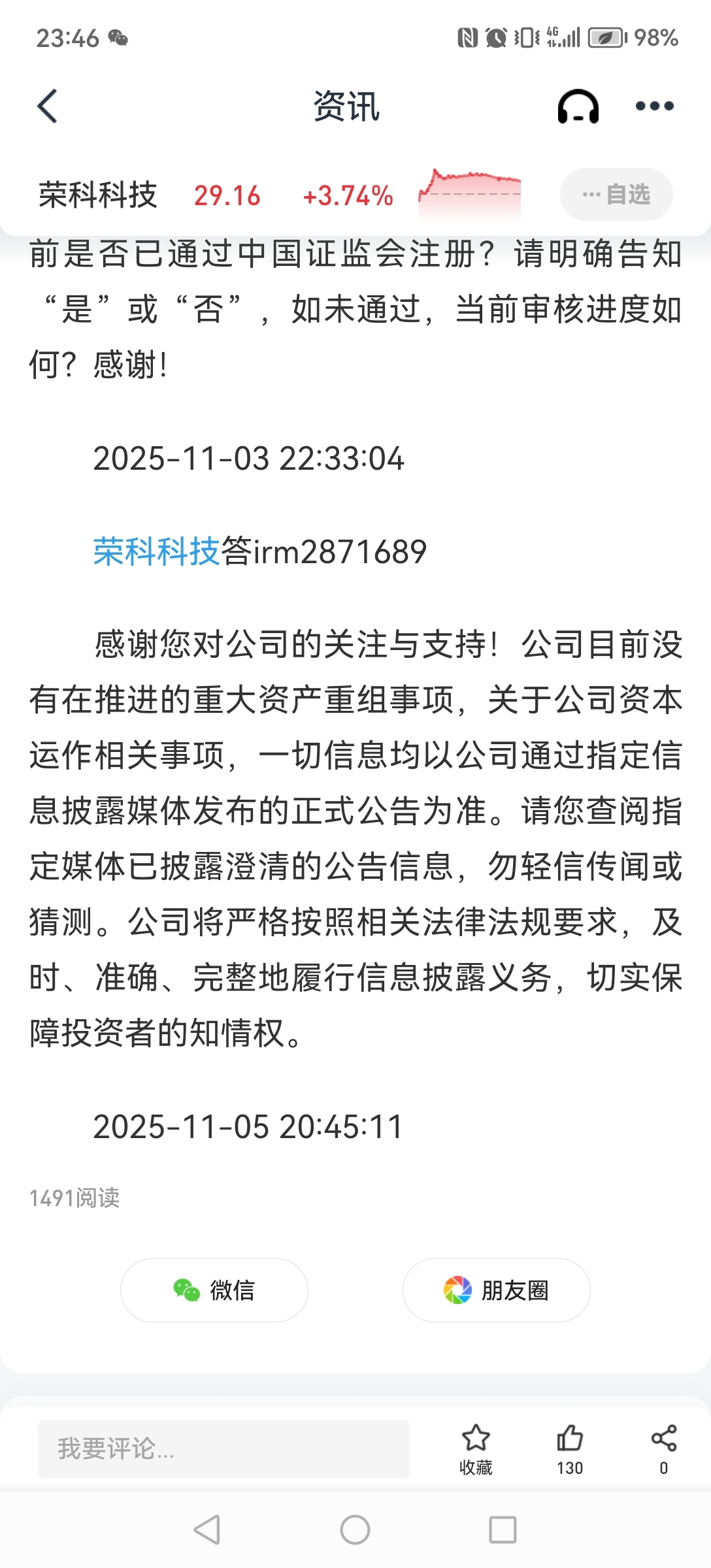 $荣科科技(SZ300290)$ 11月3日前天晚上的提问为什么今天晚上来回答?小周董秘明显故意而为之啊,故意降温吗?怕压不住吗?主力高度控盘没有必要吧!