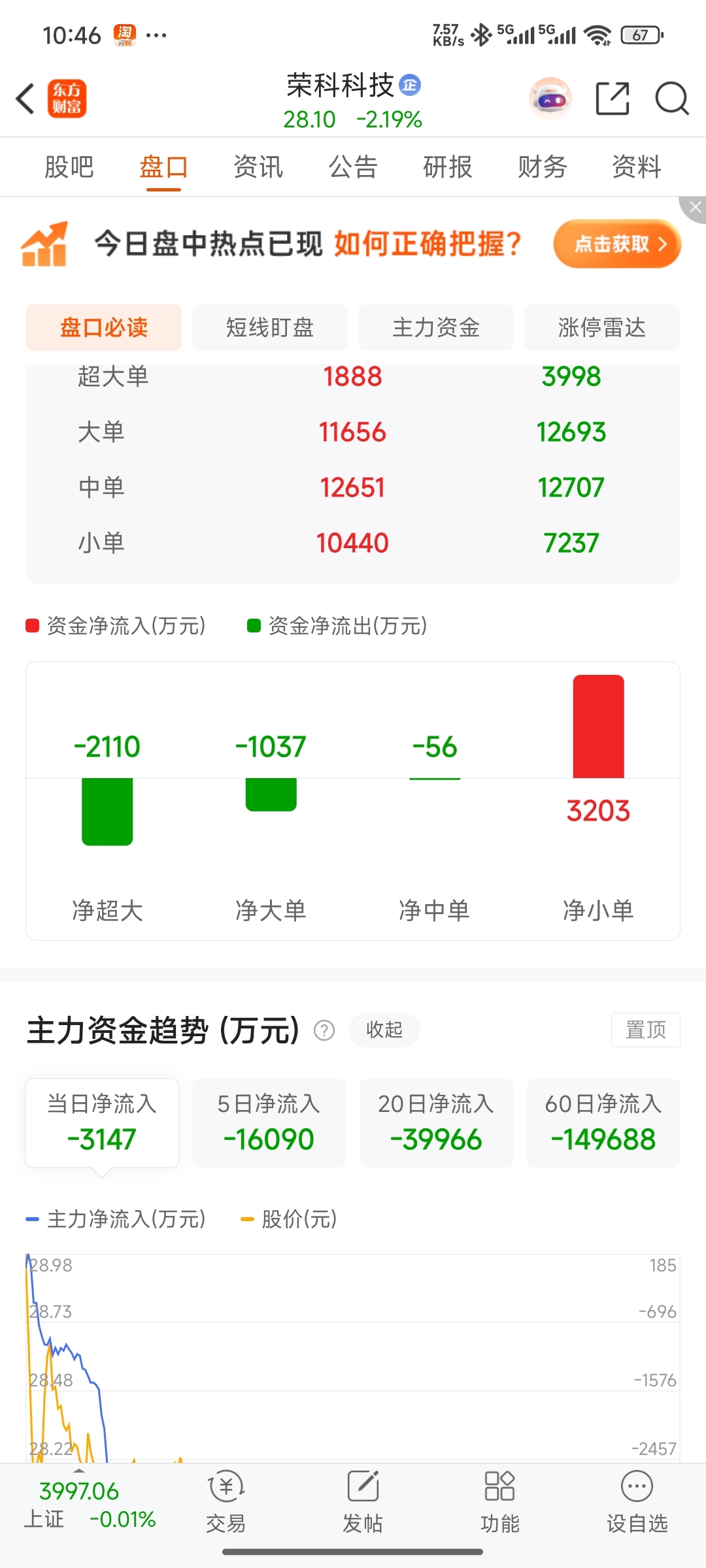 $荣科科技(SZ300290)$ 超大大单跑,散户接