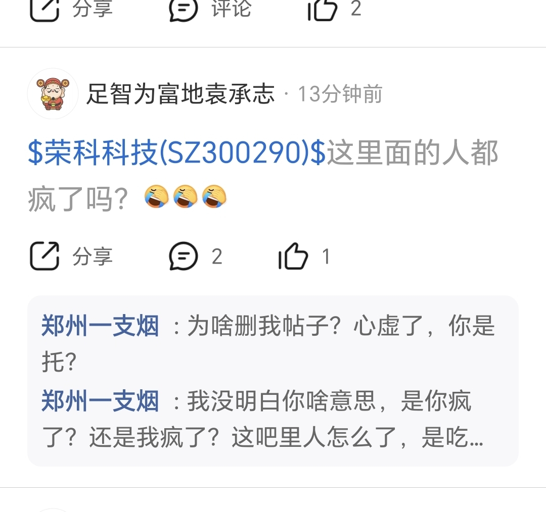 $荣科科技(SZ300290)$ 你别删我帖子,吧里人是吃你家大米了,还是你找跌找不到,你要没事下班了都回家陪陪老婆孩子,你不想发财来这吧里干啥,要不趁早G,要不换个名字再进来