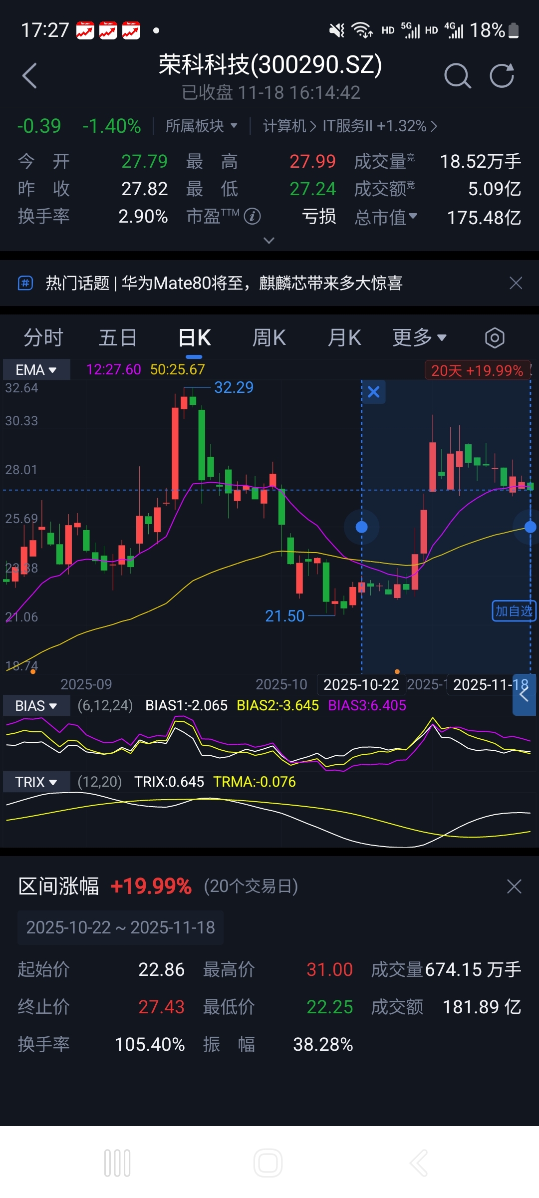 荣科近20日涨幅19.99%,创业板综指近20日涨0.75%,荣科成功躲过了20