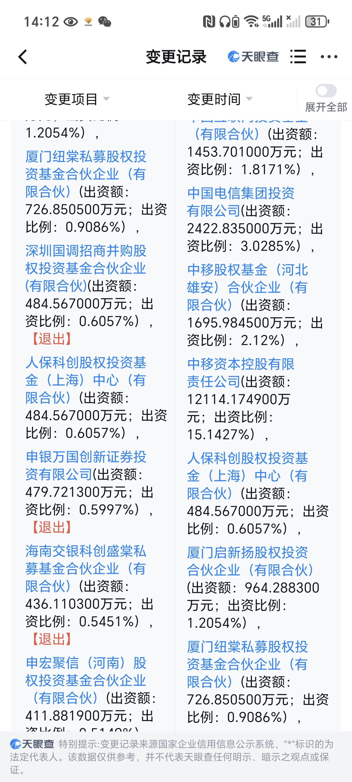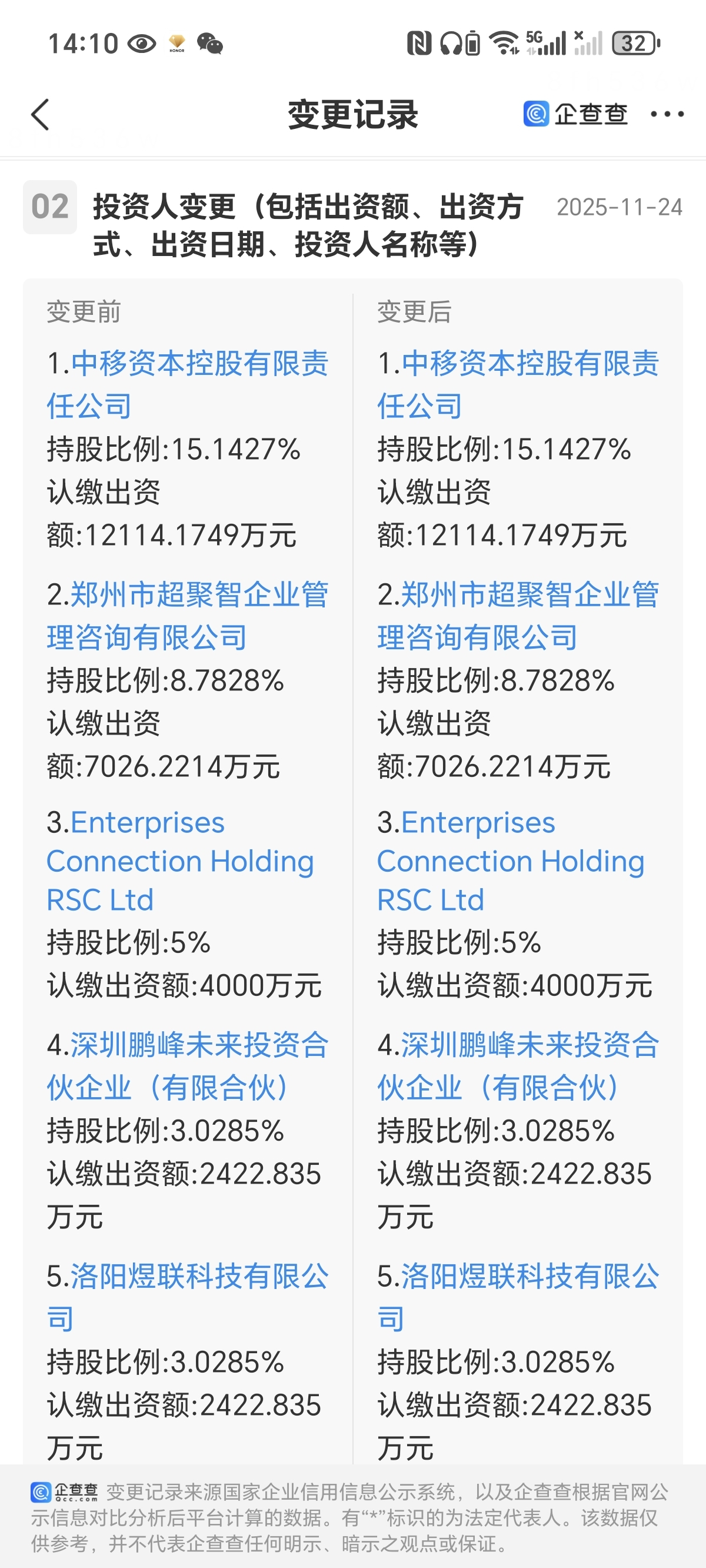 $荣科科技(SZ300290)$ 企查查和天眼查都已更新,确定中移动股份跟以前一样没有变化