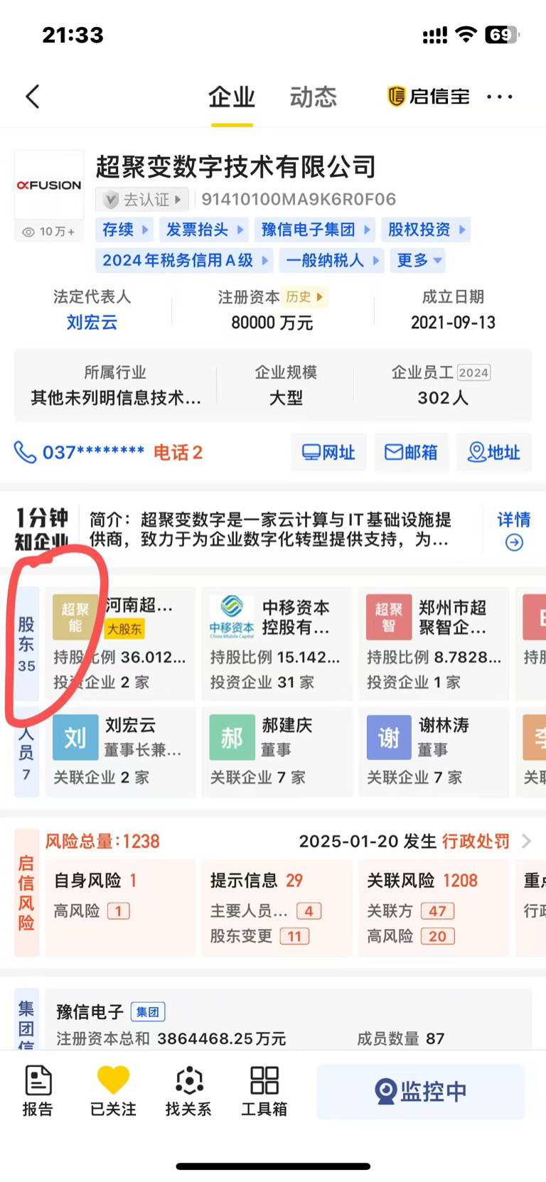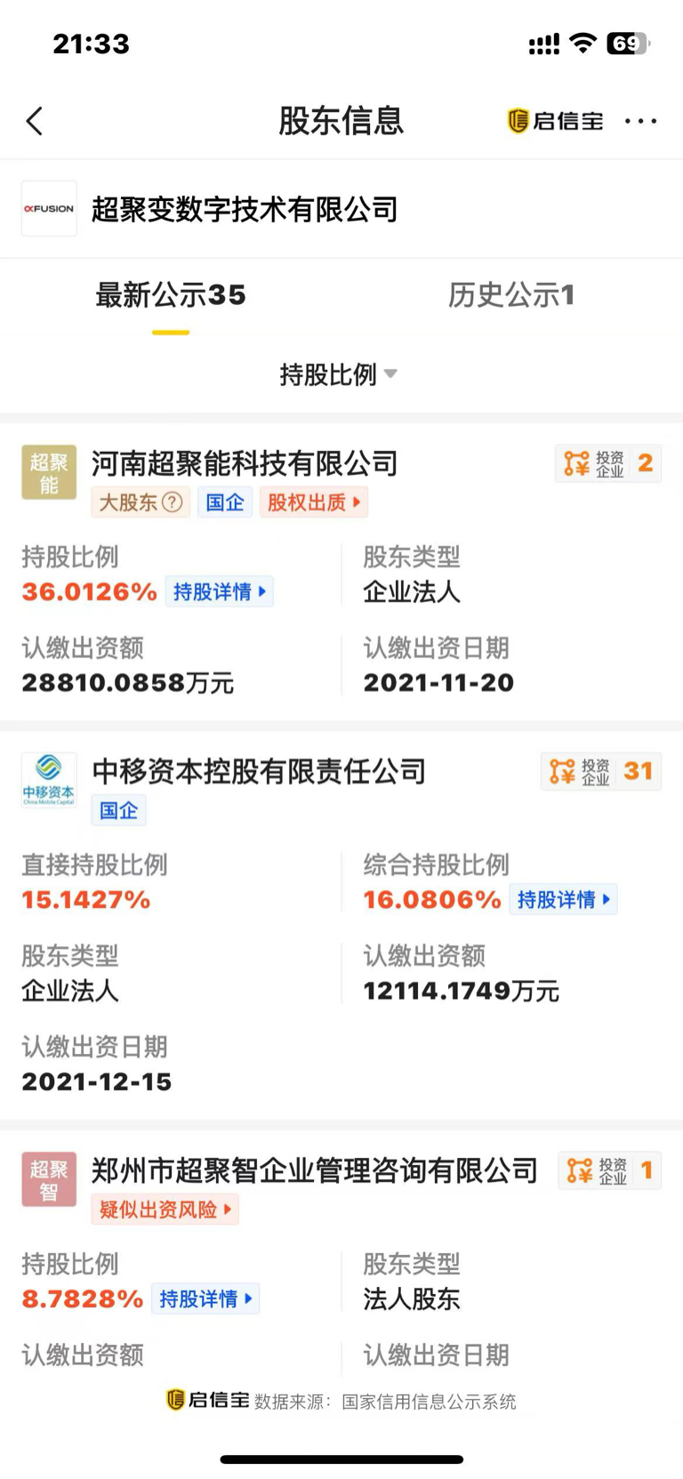 启信宝找到超聚变主页,股东35位置点一下,能看到明细……长图上传多次,上传失败!