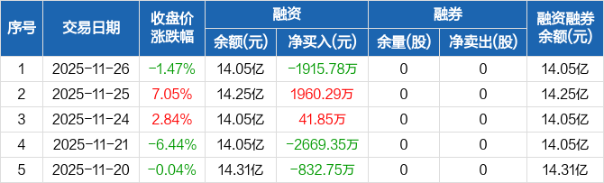 荣科科技:融资净偿还1915.78万元,融资余额14.05亿元(11-26)