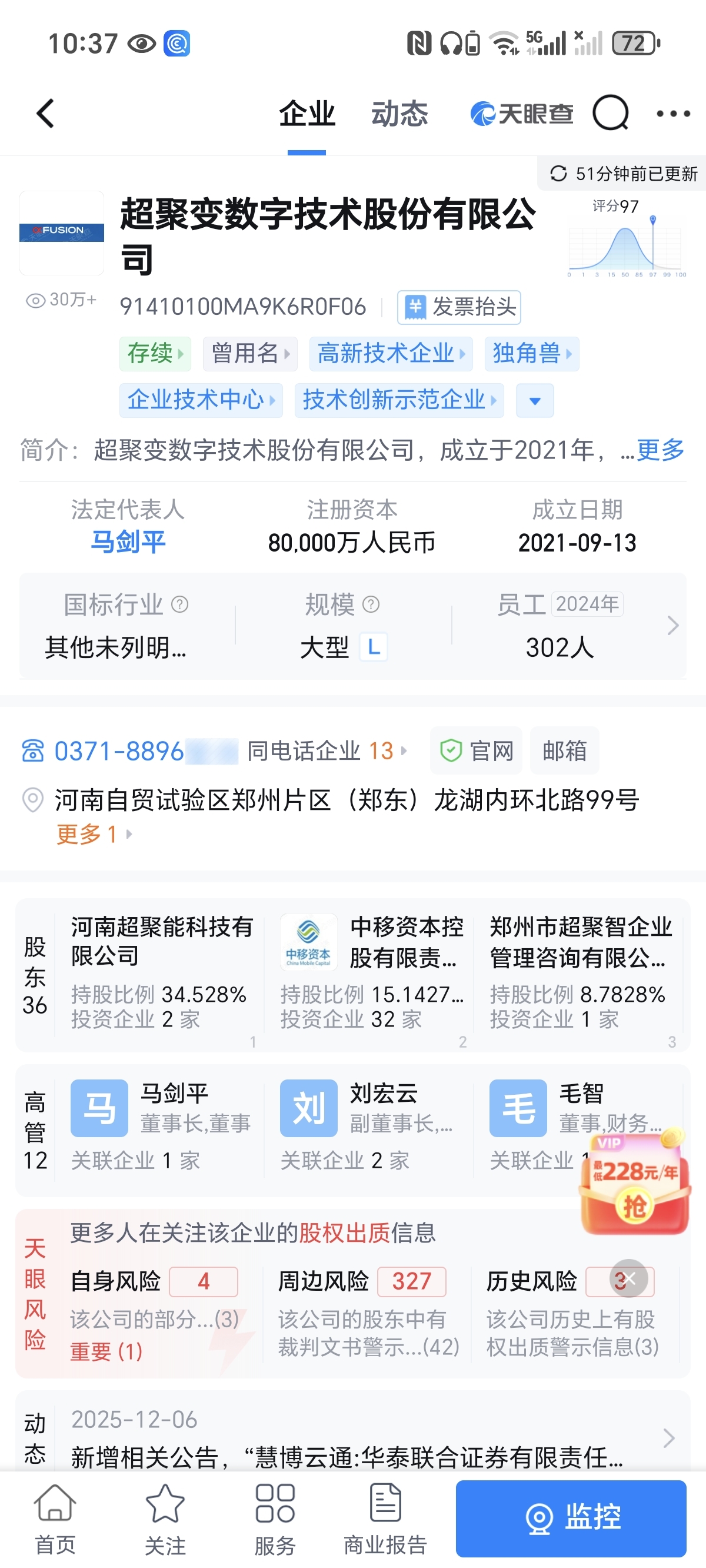 超聚变数字技术有限公司名字已变更为股份有限公司,法定代表人刘宏云变更为马剑平。