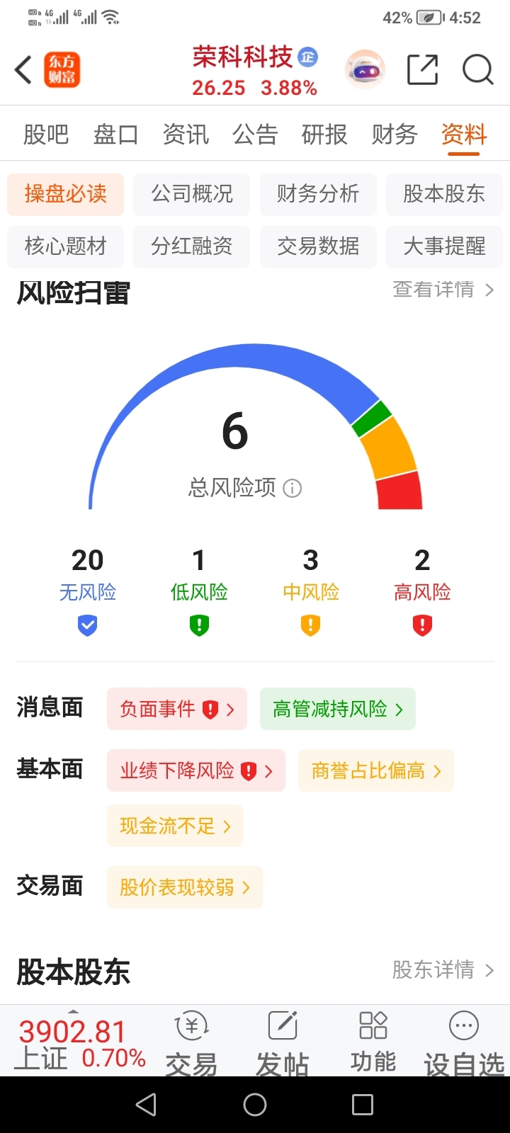 $荣科科技(SZ300290)$ 荣科科技,还有2大高风险,3大中风险。1个低风险,还有被通报了的违规事件。还有高管减持,但股价为就一涨再涨。而长信科技质地比荣科科技好10倍,为股价反而一跌再跌。连荣科科技股价的零头都不到。这个市场到底在炒什么?